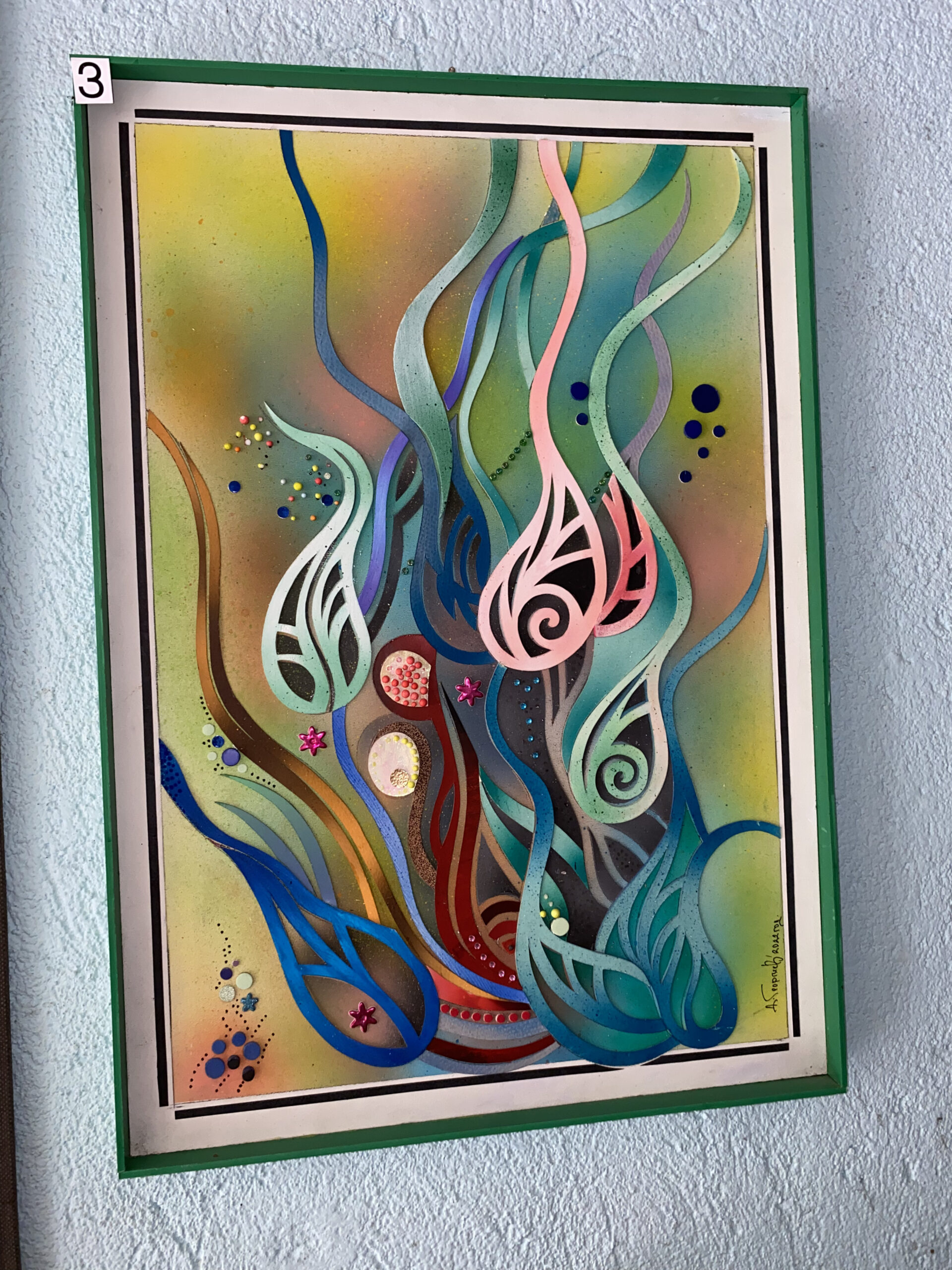 Абстрактна морска композиция с пулсиращи водорасли и коралови форми, изградена с аерограф и висококачествени релефни материали. Фонът прелива в слънчево‑жълти, лаймови и аквамаринови нюанси, върху които се извисяват тюркоазени, лазурни и коралово‑розови ленти с перлени точки и миниатюрни „звезди“. Основата е акварел, запечатан с безцветен защитен лак за дълготрайна яркост и фин блясък.