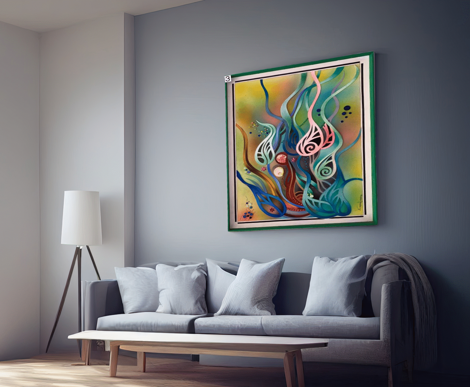 Произведението е в елегантна зелена рамка със светло паспарту — готово за окачване и за моментален свеж акцент в модерния интериор.