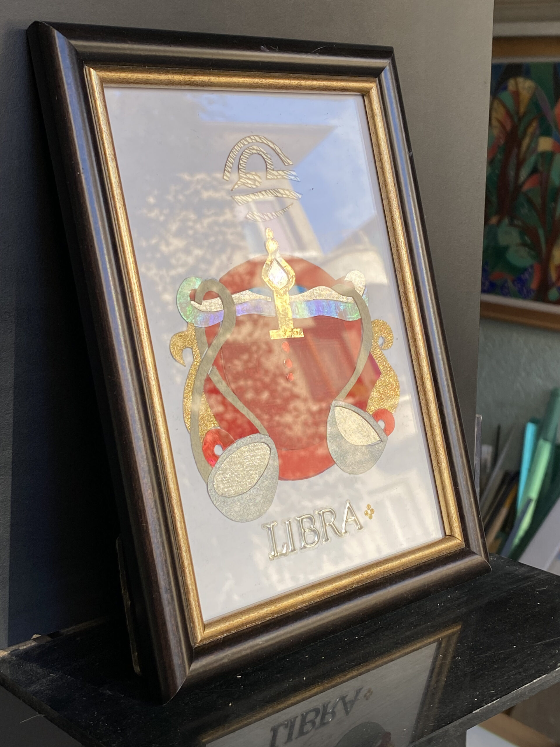 Везни е знак на равновесие, такт и красиви пропорции. Тази версия съчетава сребристи везни върху наситен червен медальон, с иридесцентен глиф и лъскави камъчета/металически елементи, които променят отблясъците си при светлина. Класическата тъмна рамка придава премиум завършекготов подарък без допълнително оформяне.