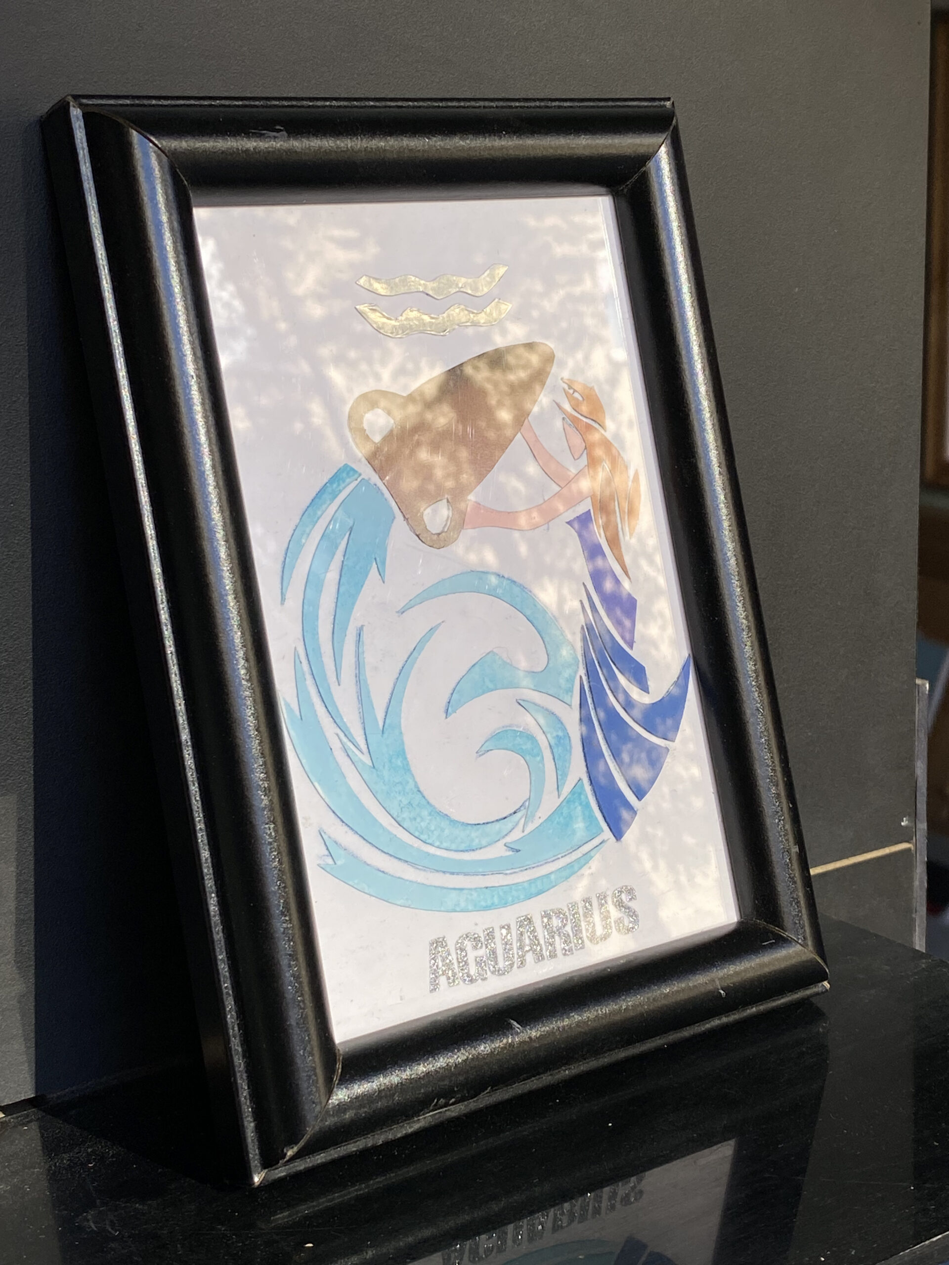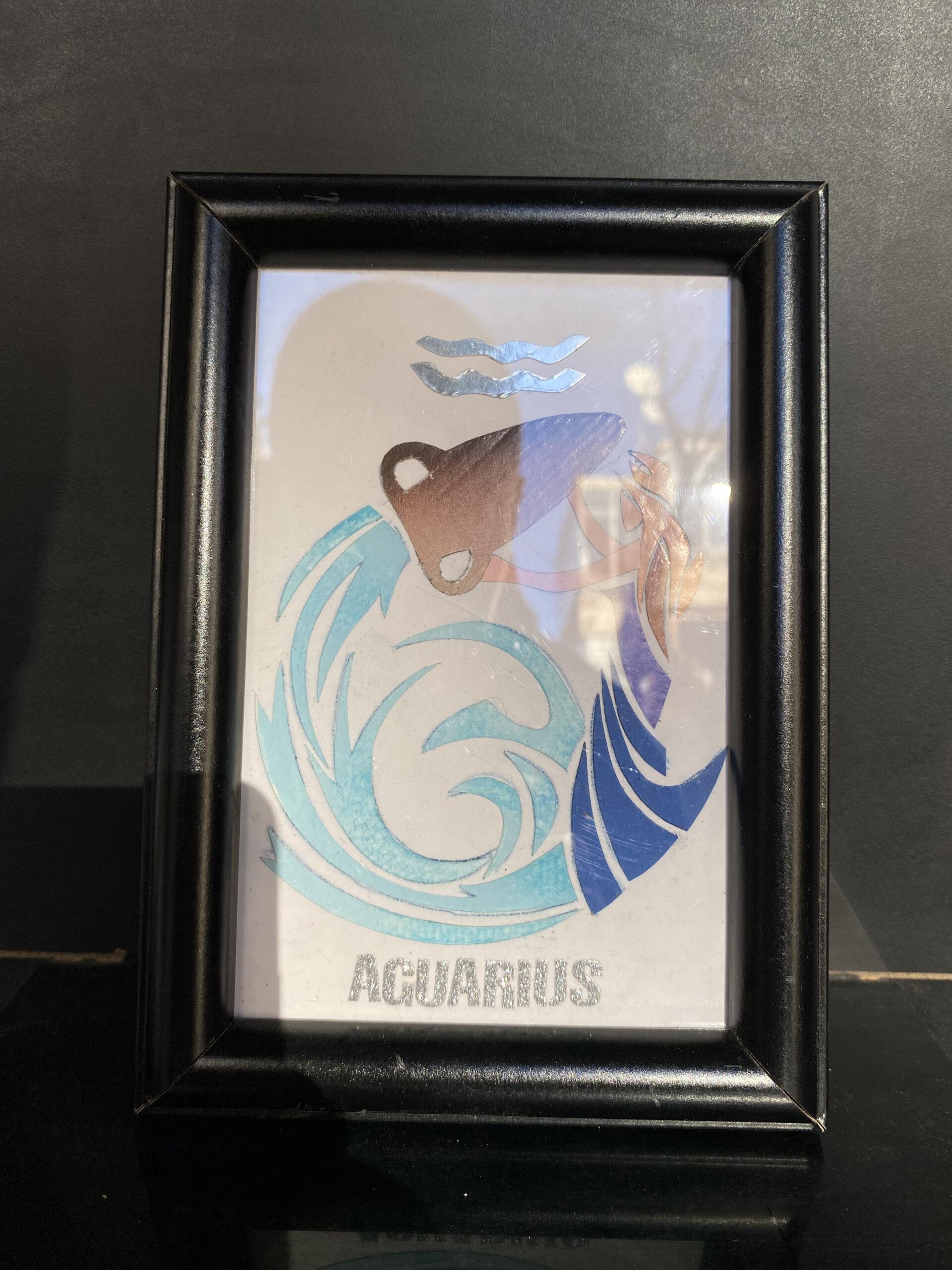 Водолей е знак на идеите, свободата и обновлението. Металическите отблясъци по символа и надписа „AQUARIUS“ играят със светлината, а чистите сини и тюркоазени тонове добавят усещане за лекота и въздушна енергия. Семплата черна рамка завършва цялостната визия с премиум излъчване — перфектна за подаряване без допълнителна подготовка.