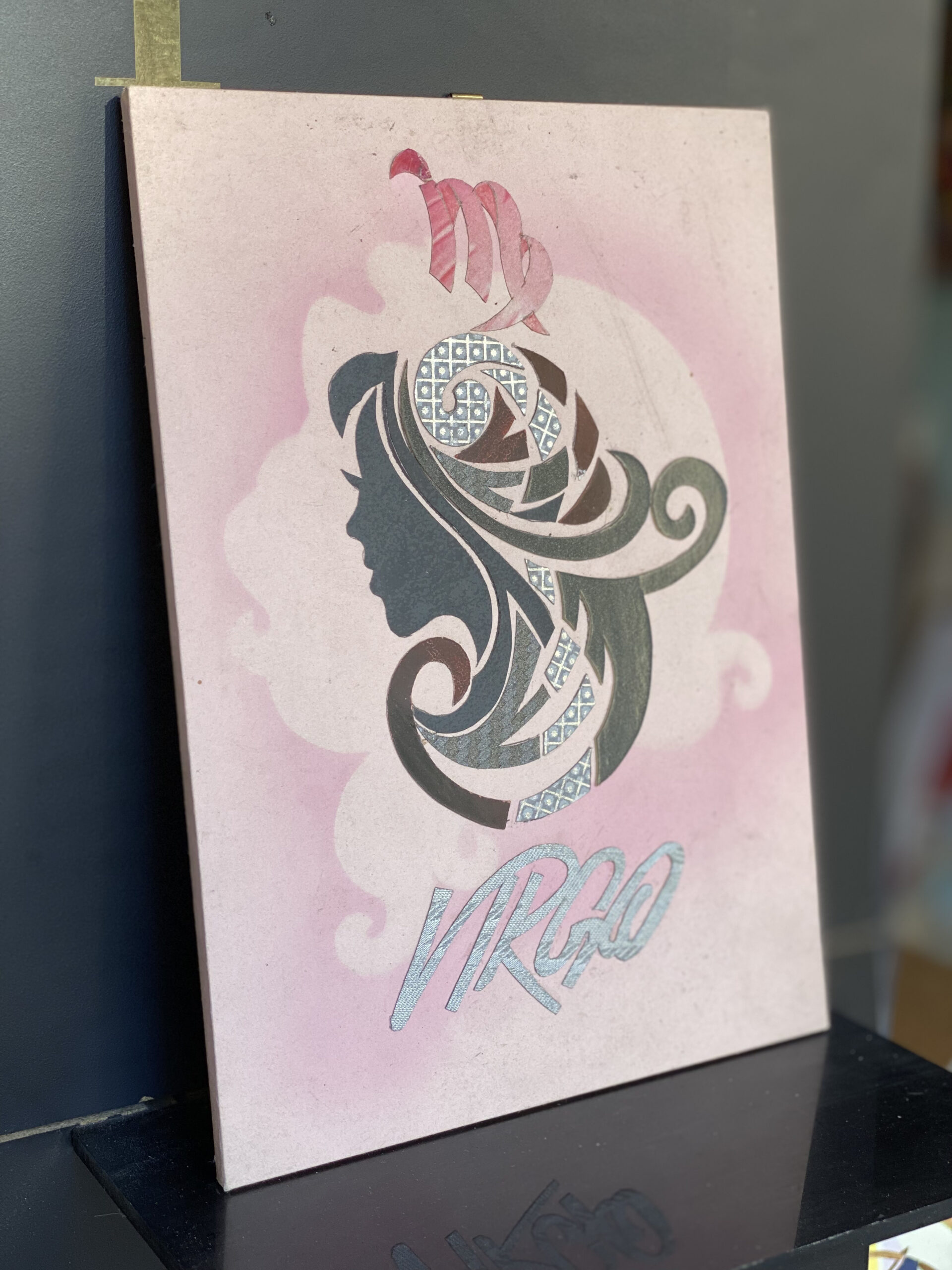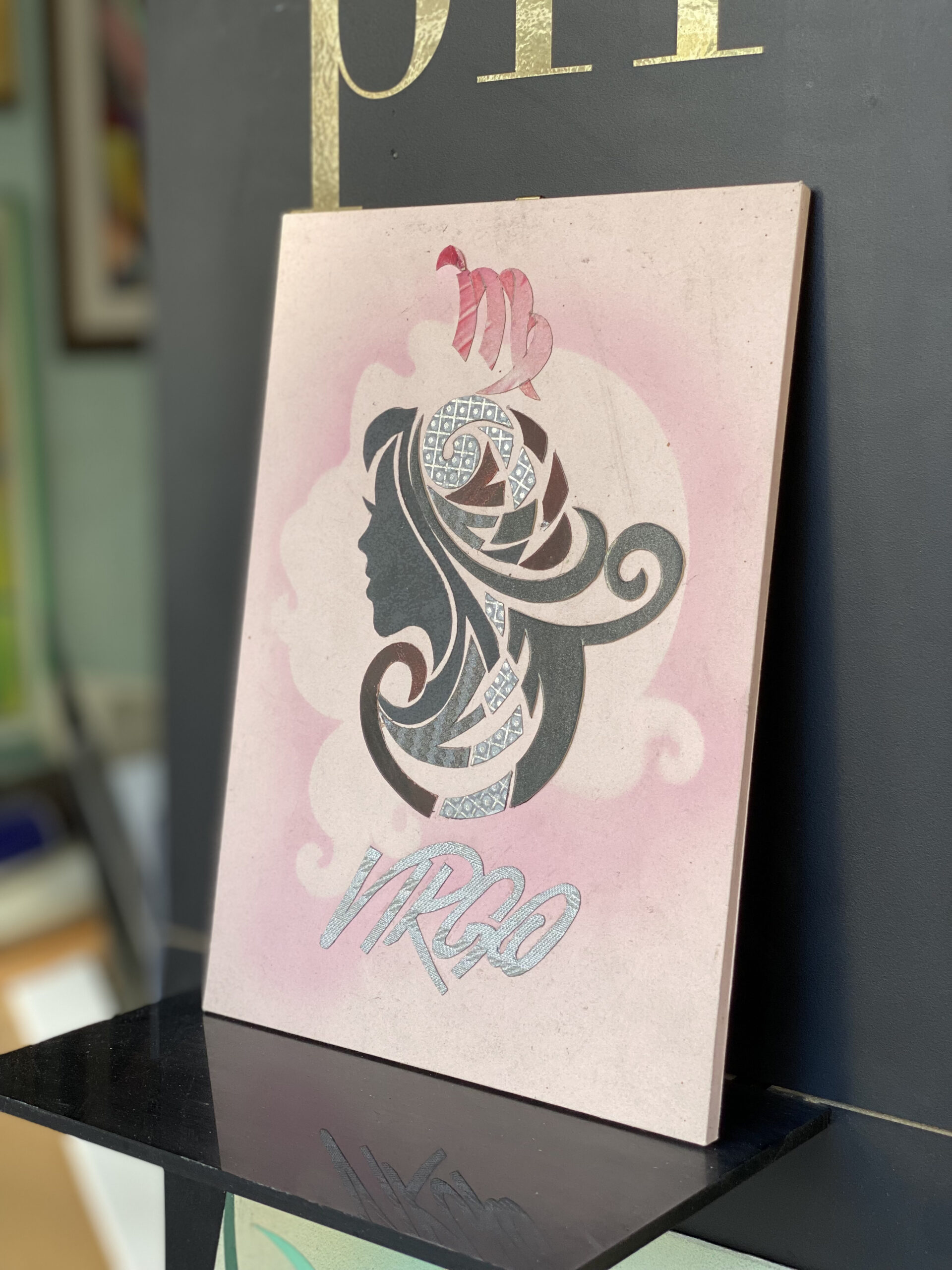 Дева е знак на ред, внимание към детайла и спокойна естетика. Тази миниатюра с елегантен женски силует върху мек розов фон носи усещане за яснота и подреденост. Металически/блестящи акценти в орнаментите и надписа подчертават финеса и правят творбата забележима на рафт, бюро или витрина.