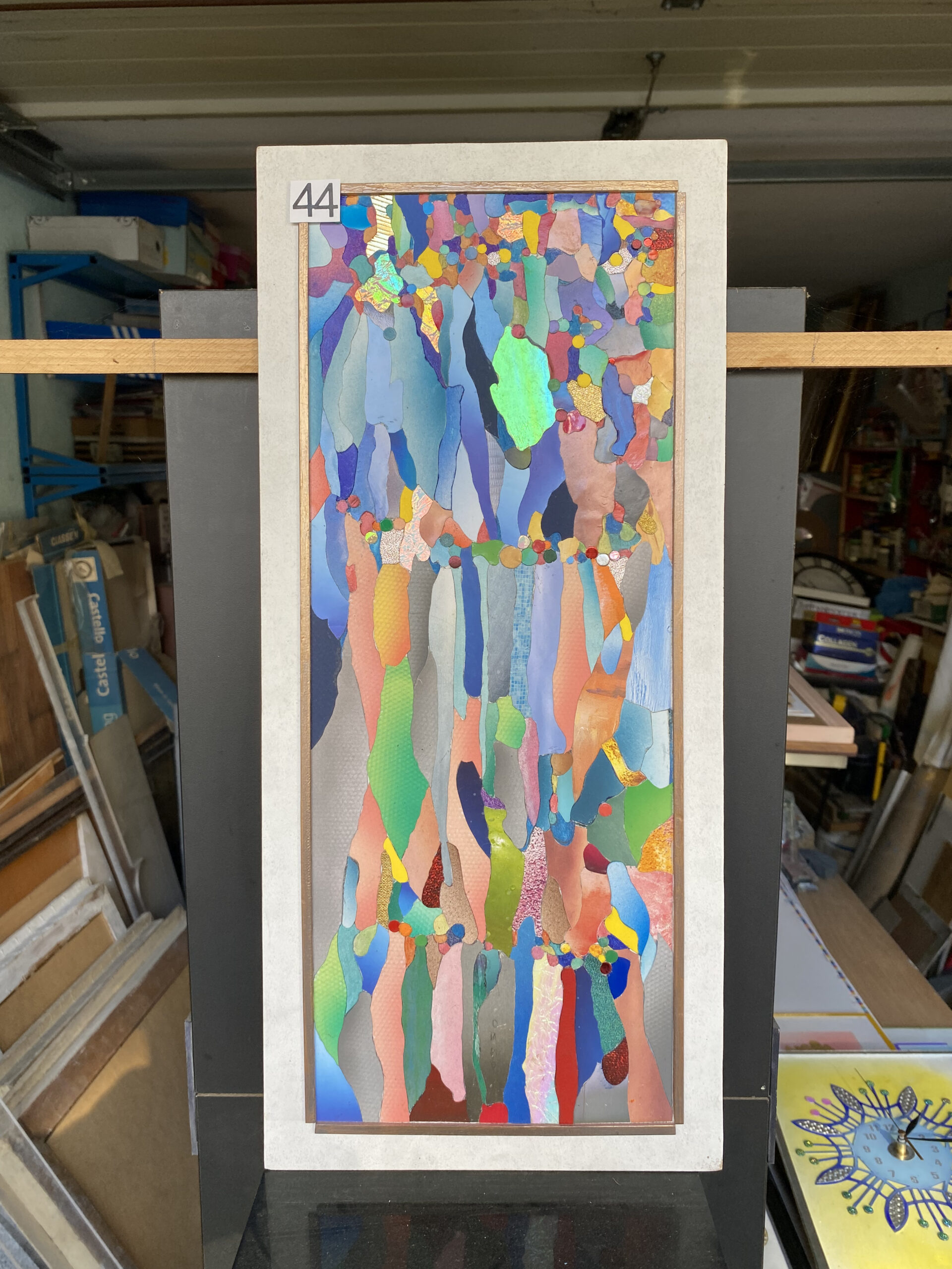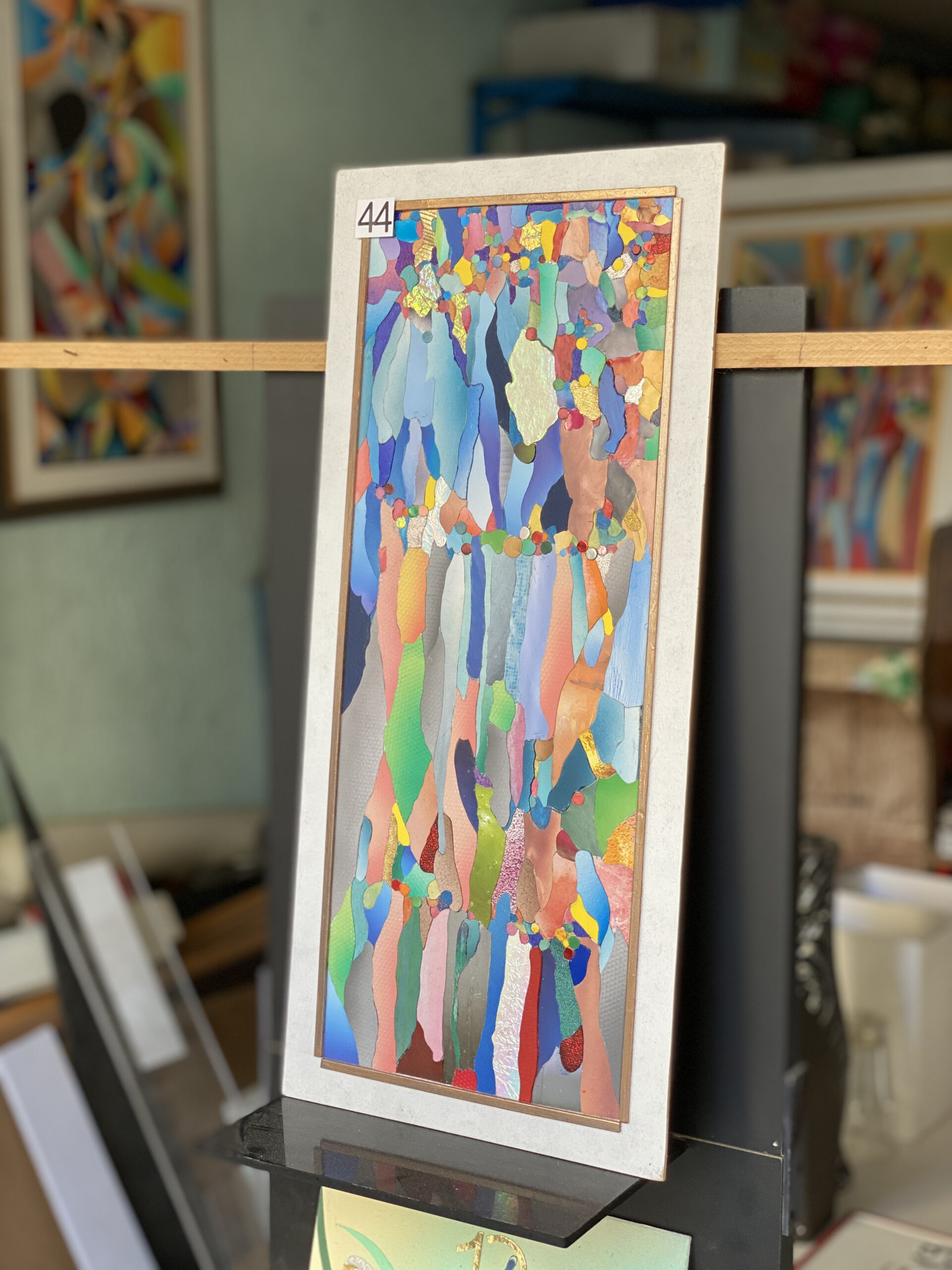 Вертикална композиция като цветен водопад: по платното се стичат органични „ленти“ в лазур, тюркоаз, корал, праскова, индиго и лайм, редуващи се с полета от перлени, металически и матови повърхности. Три „гирлянди“ от малки кръгове прекосяват картината хоризонтално и обединяват пластовете като мъниста на огърлица. В горния регистър мозаечни парченца и иридесцентни акценти искрят като минерали; по‑надолу точкови и „сетъчни“ текстури добавят тактилност. Общото усещане е за движение, „капеща“ светлина и свободна витражна ритмика.