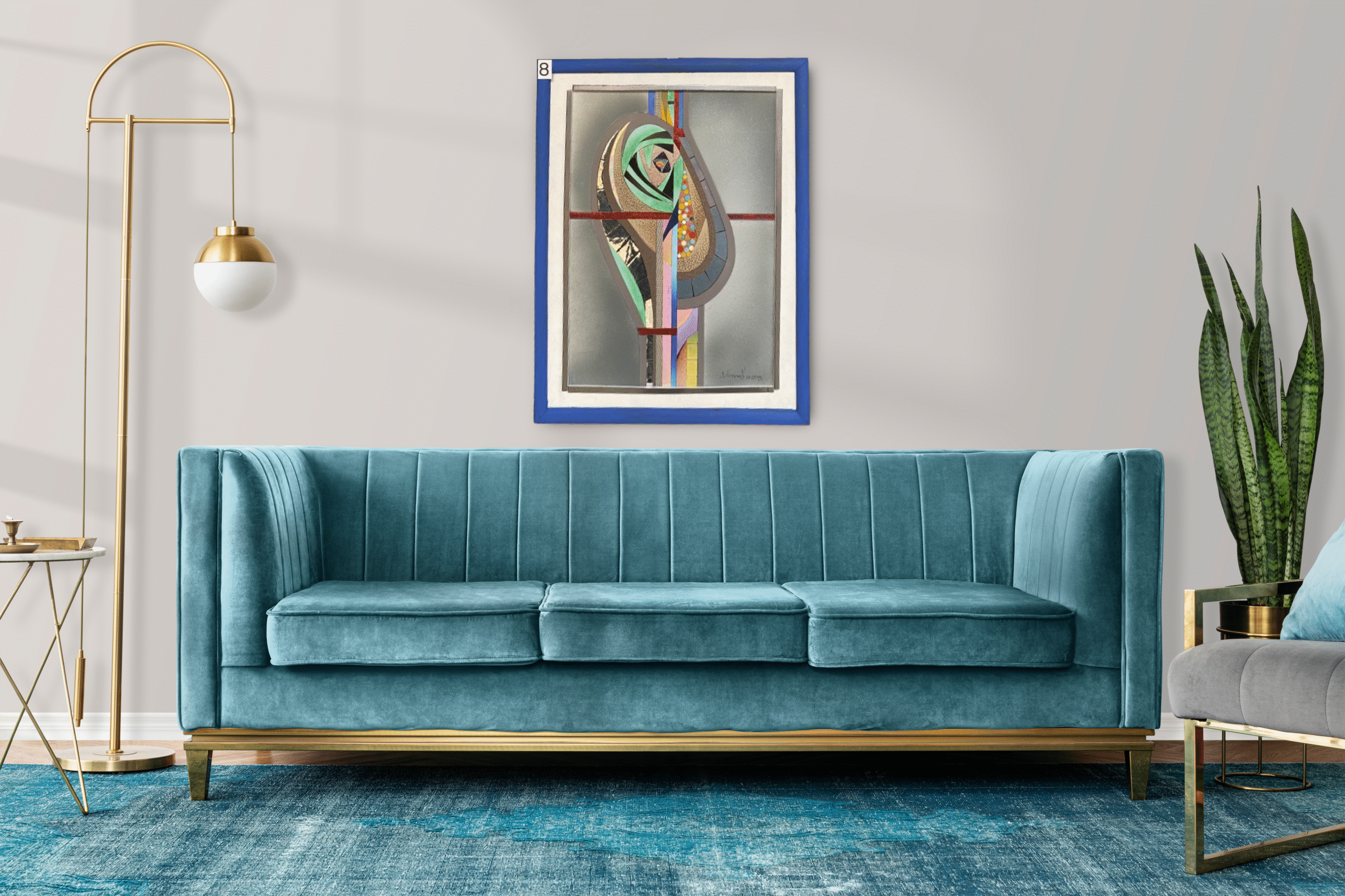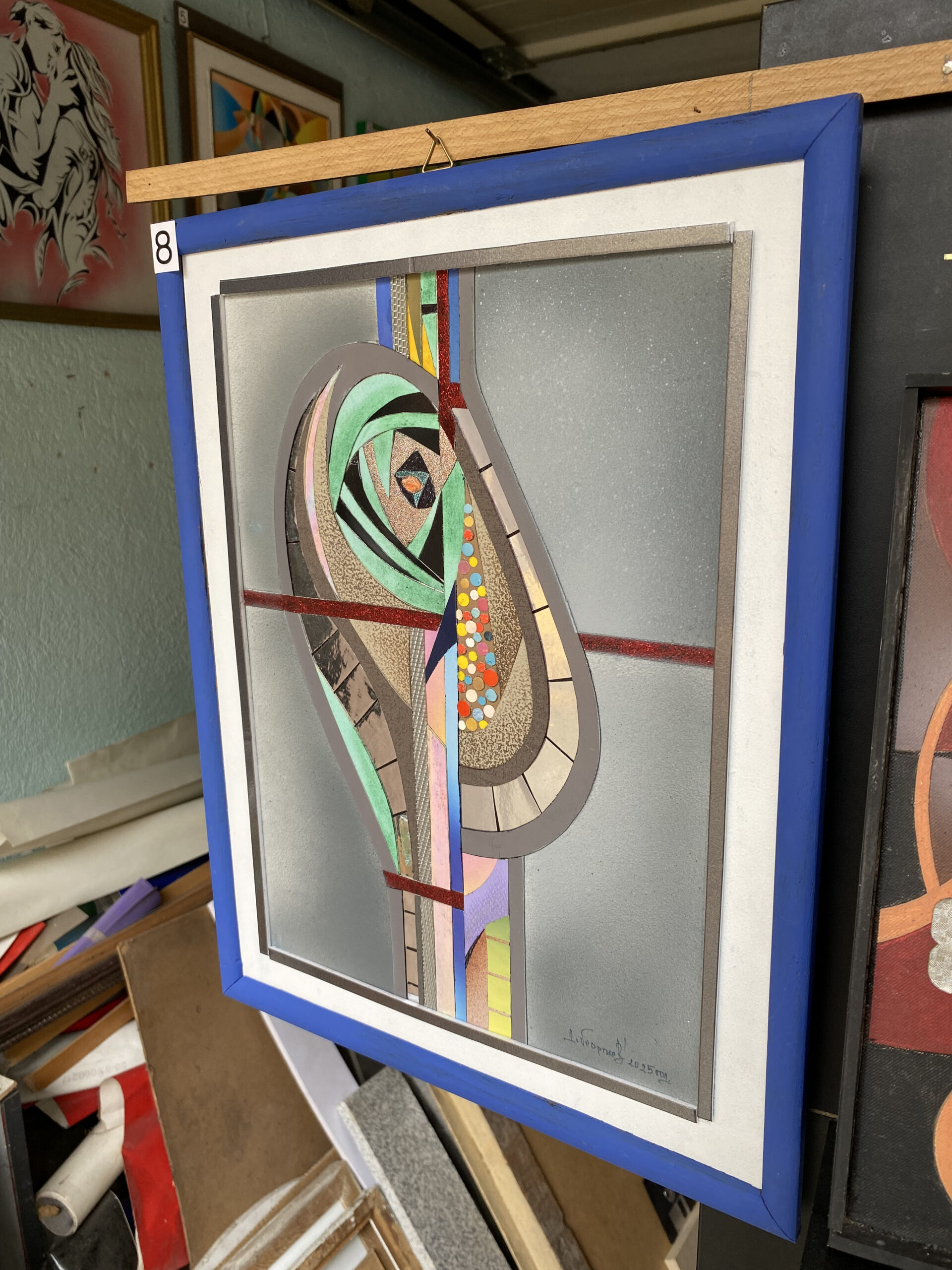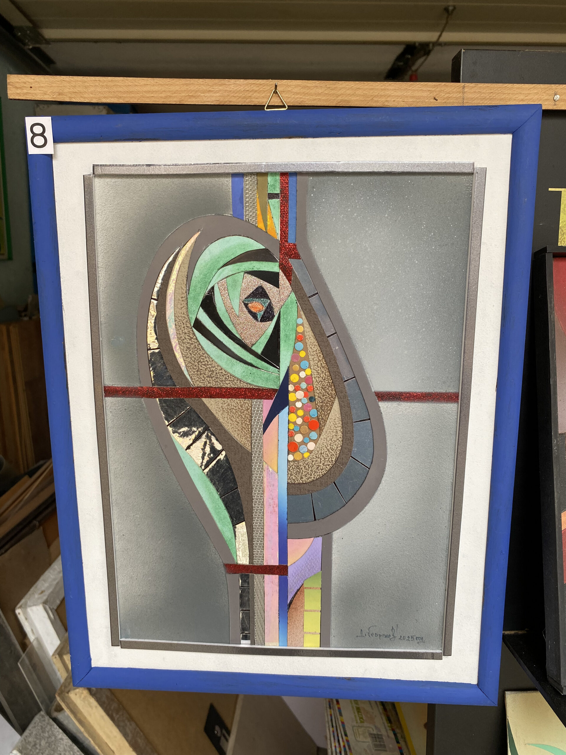Геометрична фигура‑тотем от релефни пластове и метални отблясъци, пресечена от динамични кръстосани линии. Централното ядро съчетава извити „обвивки“ в ментово и пясъчно, мозайка от цветни точки и графитни сегменти, докато вертикални и хоризонтални червени акценти придават ритъм и архитектурна дисциплинаПерлено‑сив фон изчиства сцената и оставя обекта да „свети“. Външна синя рамка с бял вътрешен кант добавя свеж контраст и завършен вид.