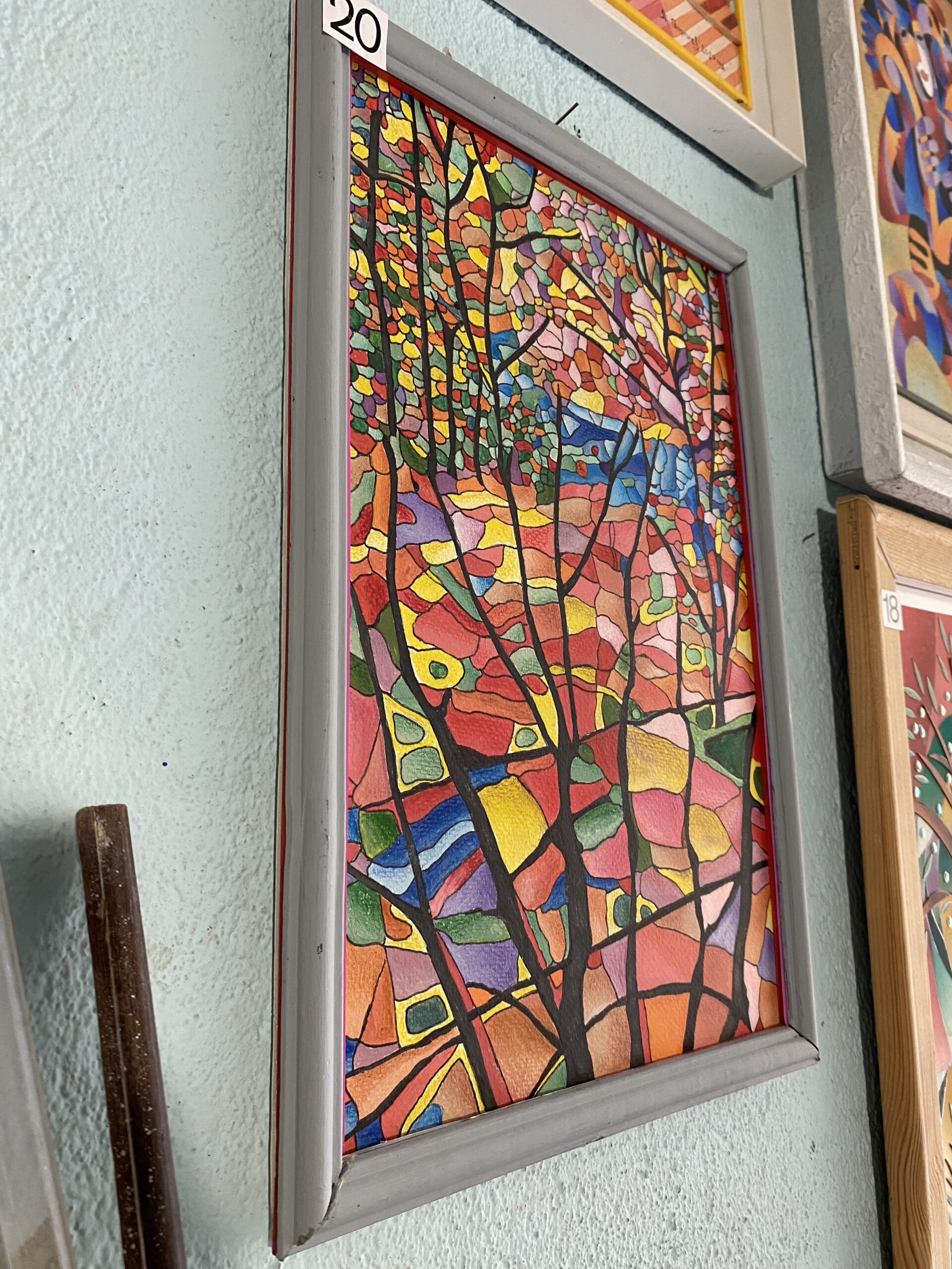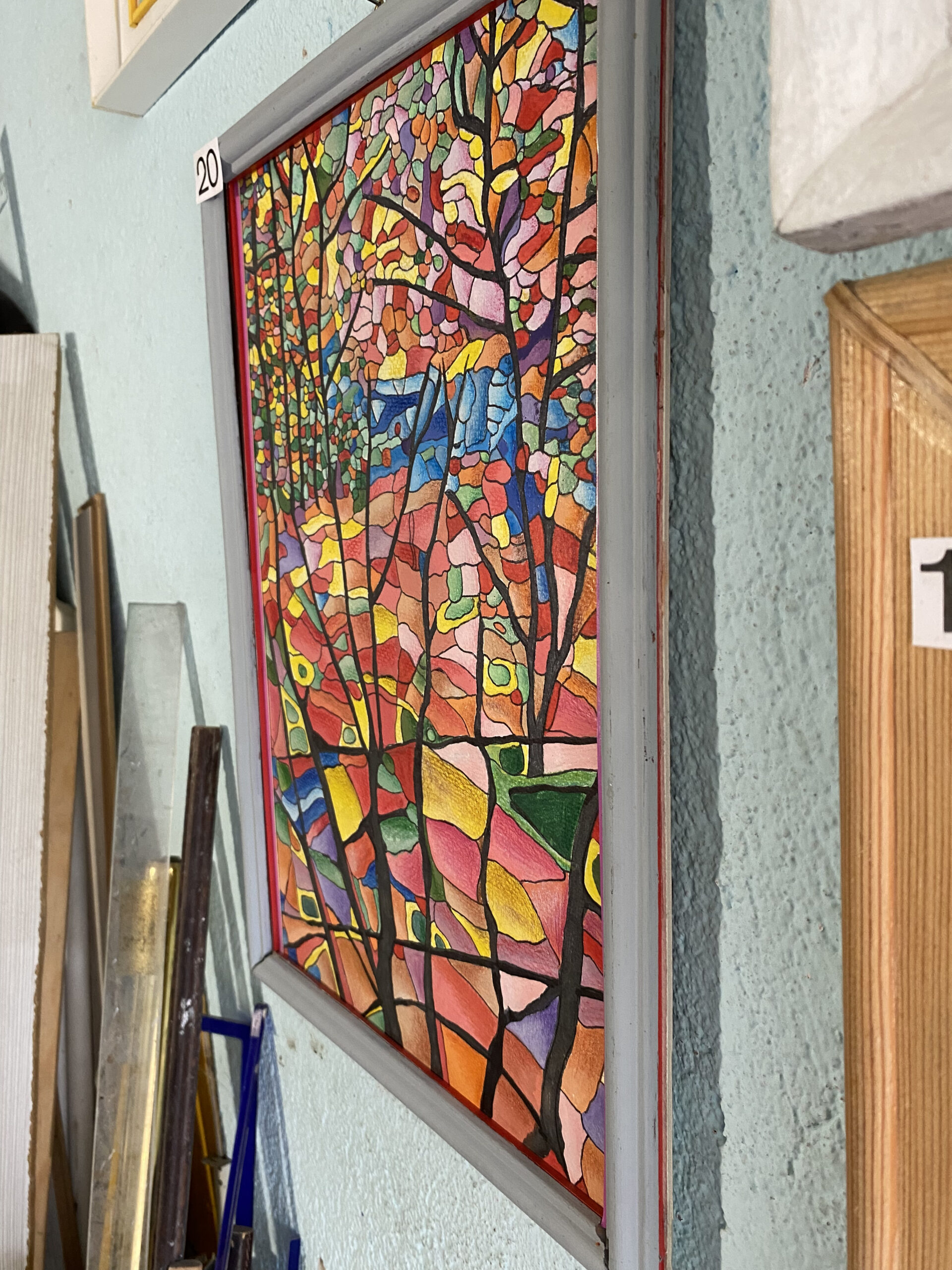 Витражно‑абстрактен пейзаж в топла есенна палитра. Черни стволове и фини клони прорязват мозайка от огнени червени, коралови и жълти полета, балансирани със зелени и сапфирени акценти. Ритъмът на „листопада“ е предаден чрез дребни цветни сегменти и контури като витраж, които придават дълбочина, светлина и движение.