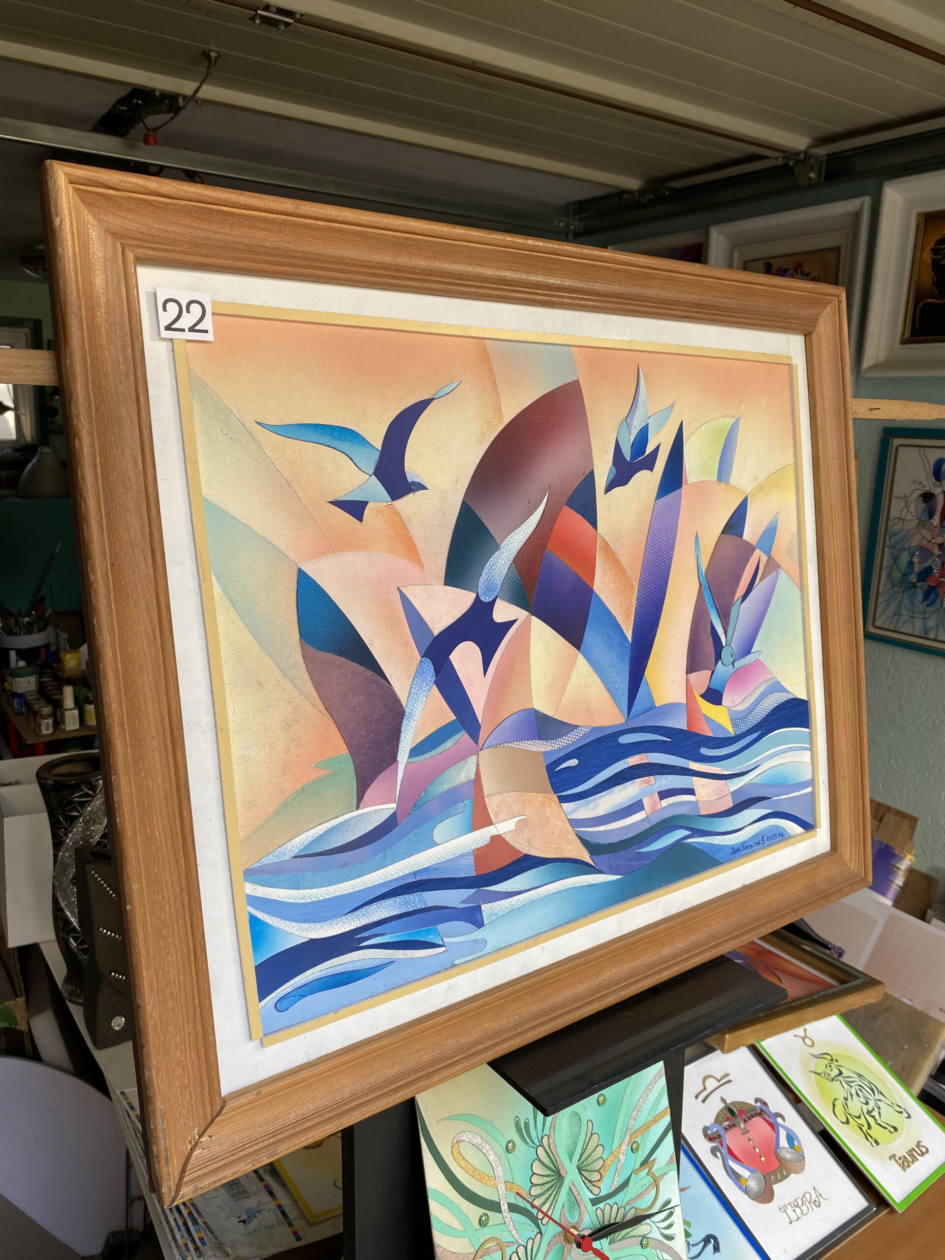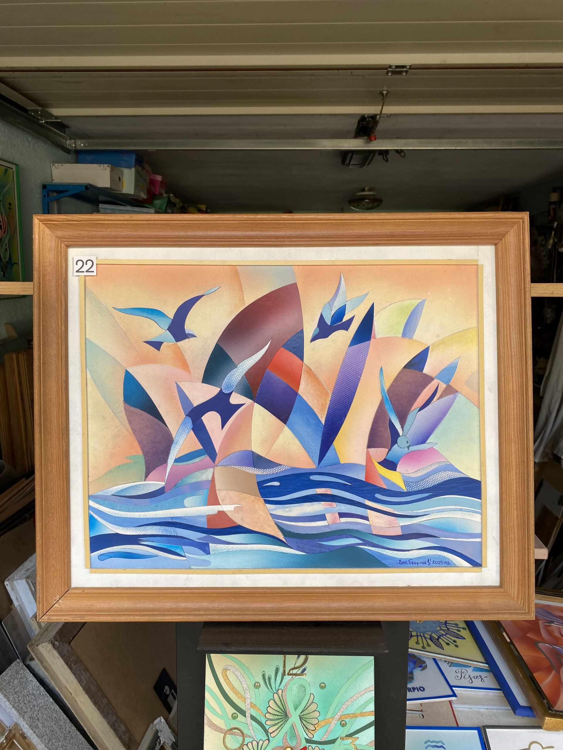 Смесена техника: аерограф за меките преливки, акрил/акварел за чистите цветни полета, фини графични контури за детайл. Хоризонтален формат в елегантна дървена рамка със светло паспарту, повърхността е защитена с безцветен лак. Оригинал, подписан от автора — готов за окачване и за силно, но ненатрапчиво присъствие.