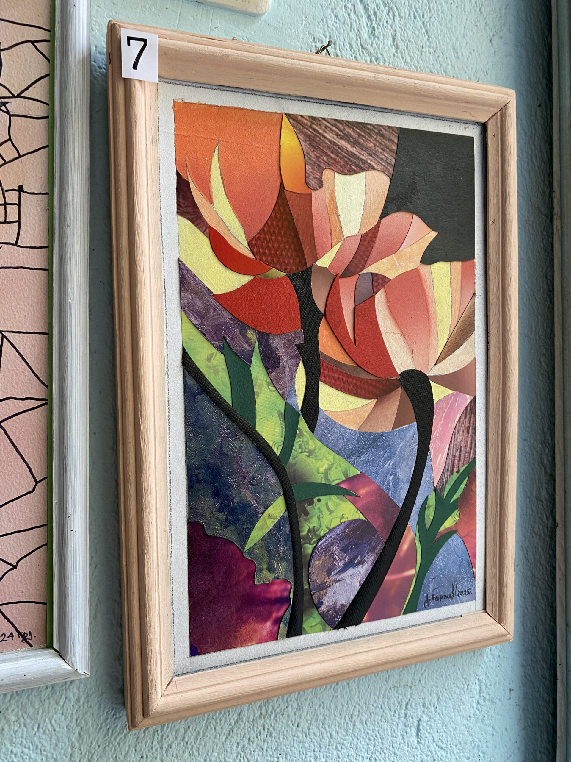 Експресивна флорална абстракция с танцуващи венчелистчета в наситени червено‑оранжеви и прасковени тонове. Елегантни черни стъбла извеждат композицията нагоре, докато фонът смесва лилави, индигови и изумрудни текстурни полета за дълбочина и контраст. Редуването на матови и леко искрящи повърхности създава жив релеф и усещане за движение — модерен, позитивен акцент за всяка стая. В светла дървена рамка — готово за окачване.