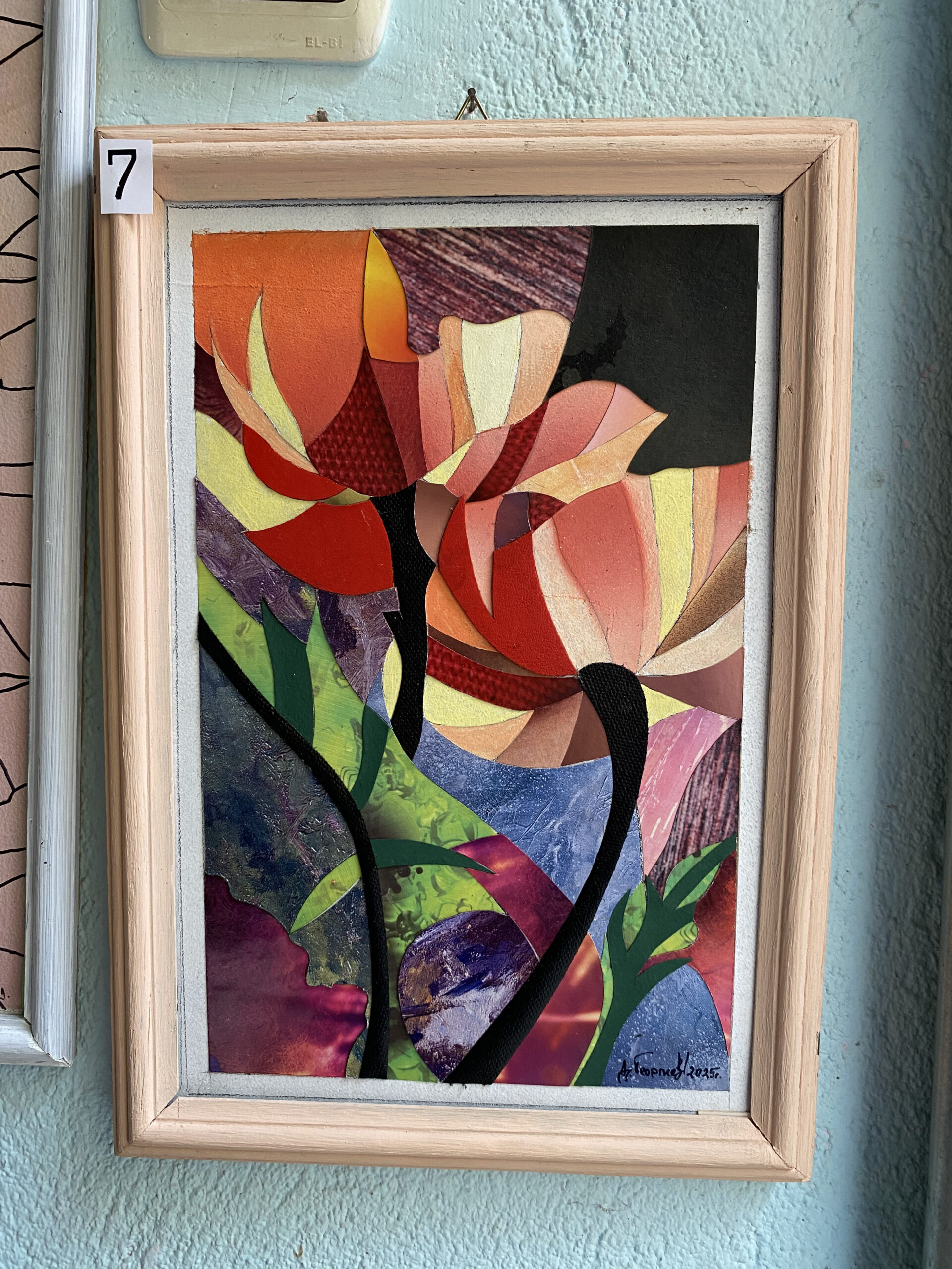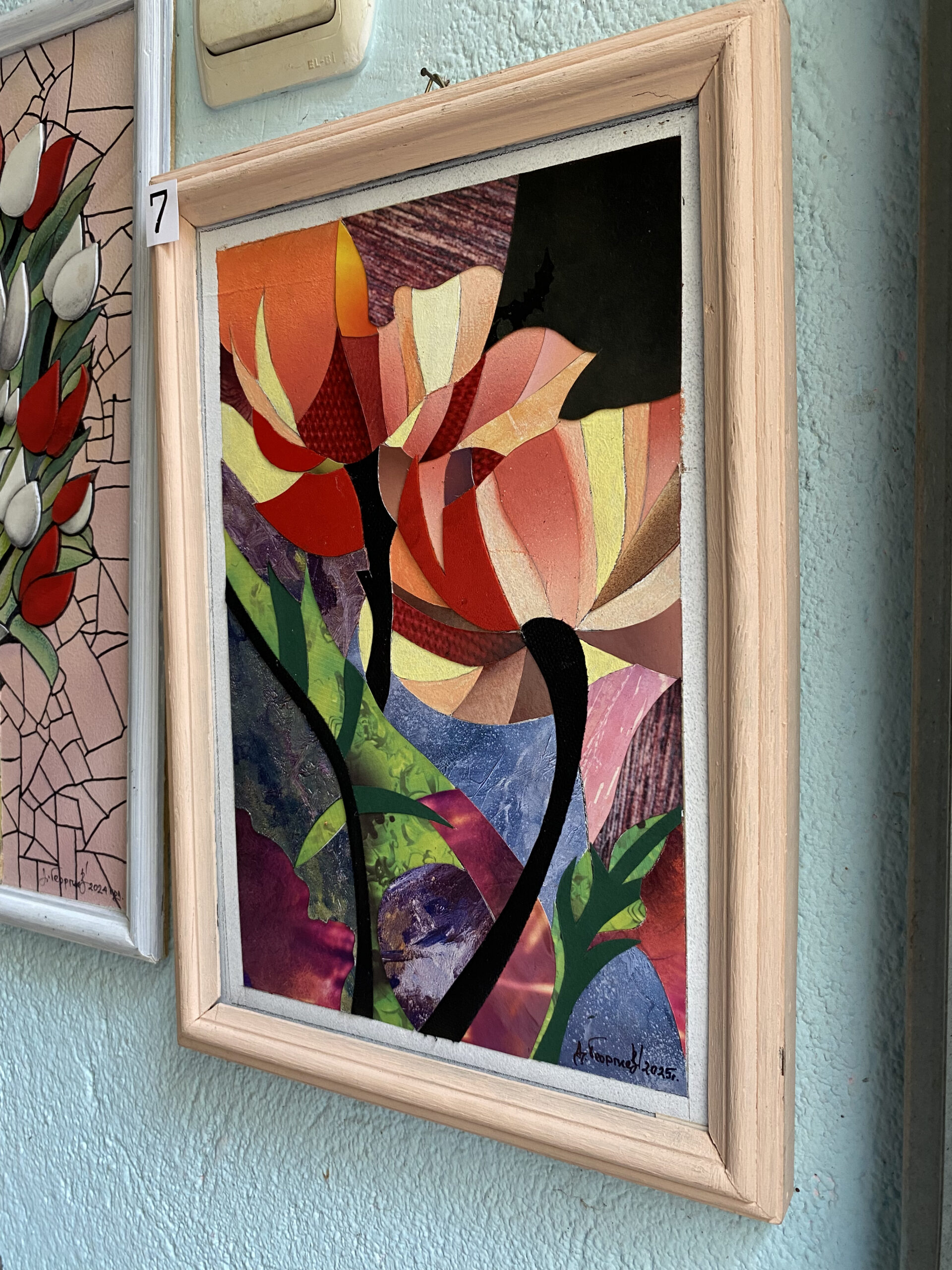 Аерограф за копринени преливки и ефирност; акварел за богати, прозрачни тонове; висококачествени релефни материали за тактилни акценти; фини графични контури за яснота. Повърхността е защитена с безцветен лак за трайна яркост. Оригинал с авторски подпис.