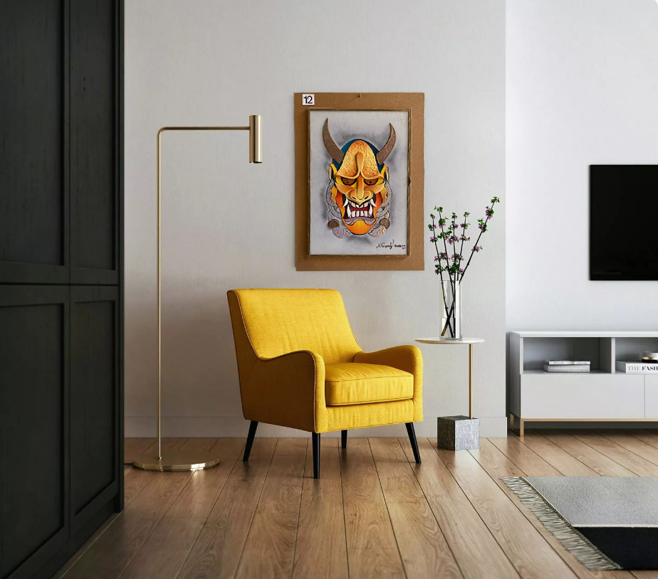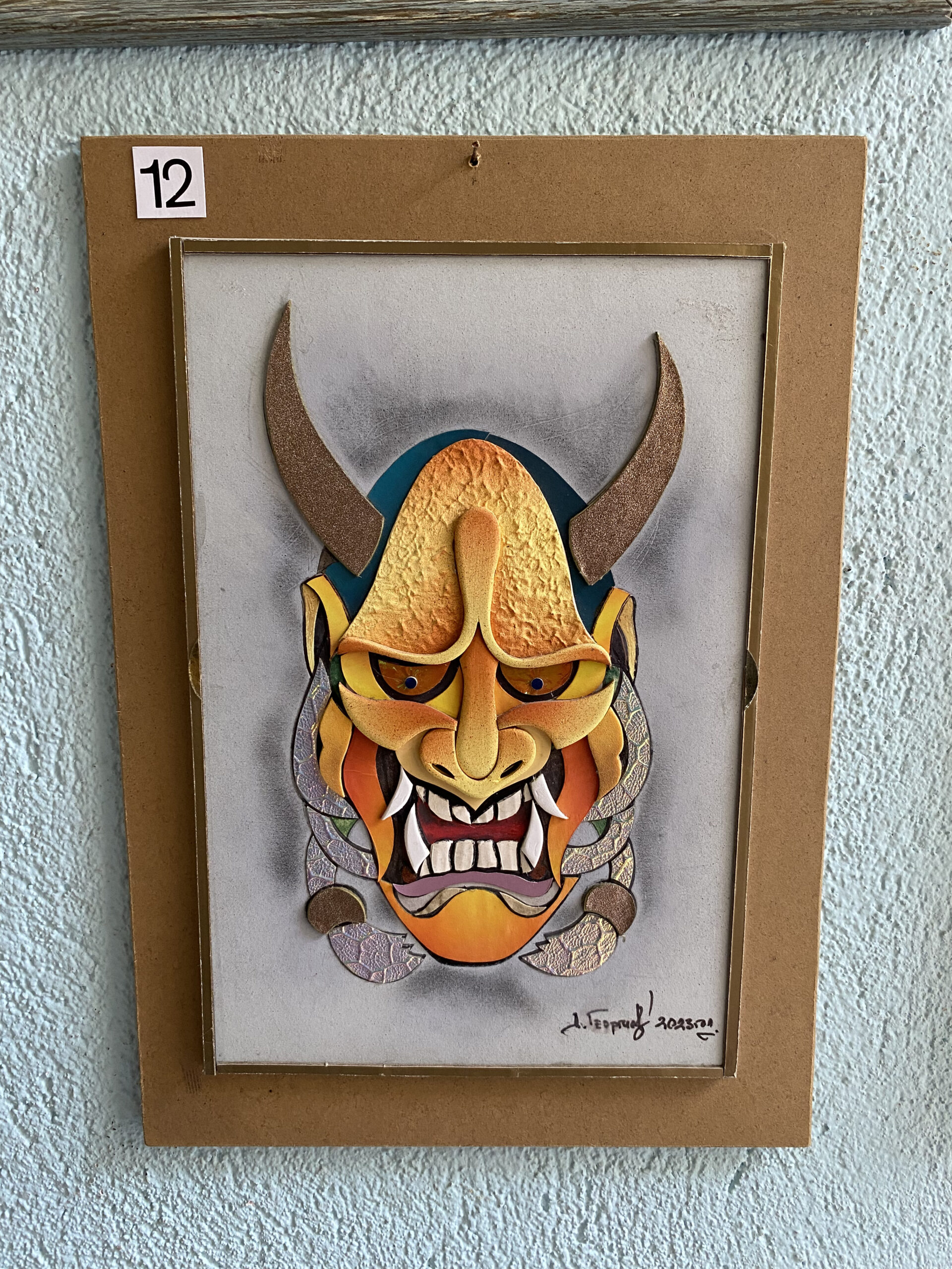Декоративно пано с етническа маска, изградена на множество слоеве за мощен пространствен обем. Топлите оранжево‑златни тонове са подчертани с блестящи акценти и тактилни зони; роговидни елементи рамкират лицето, а чистият перлено‑сив фон подсилва драмата на силуета. Контролираните светлосенки и релефът създават усещане за присъствие и сила — модерен арт‑обект с характер.