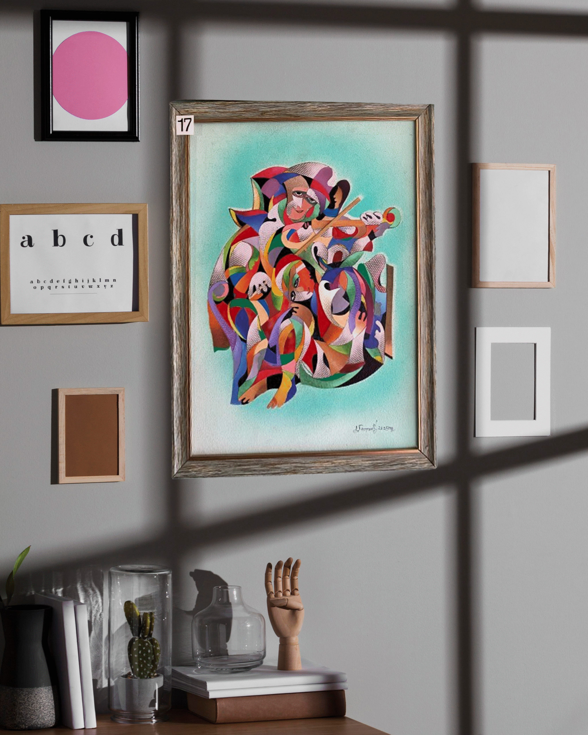 Това е жива цветна картина на цигулар, изградена от много малки цветни части като пъзел. В нея се виждат различни лица и профили, които напомнят как музиката докосва всеки човек по различен начин. Цветовете са весели и балансирани, а мек тюркоазен фон прави фигурата ясна и приятна за гледане. Гледаш я и усещаш движение, усмивка и човешка близост.