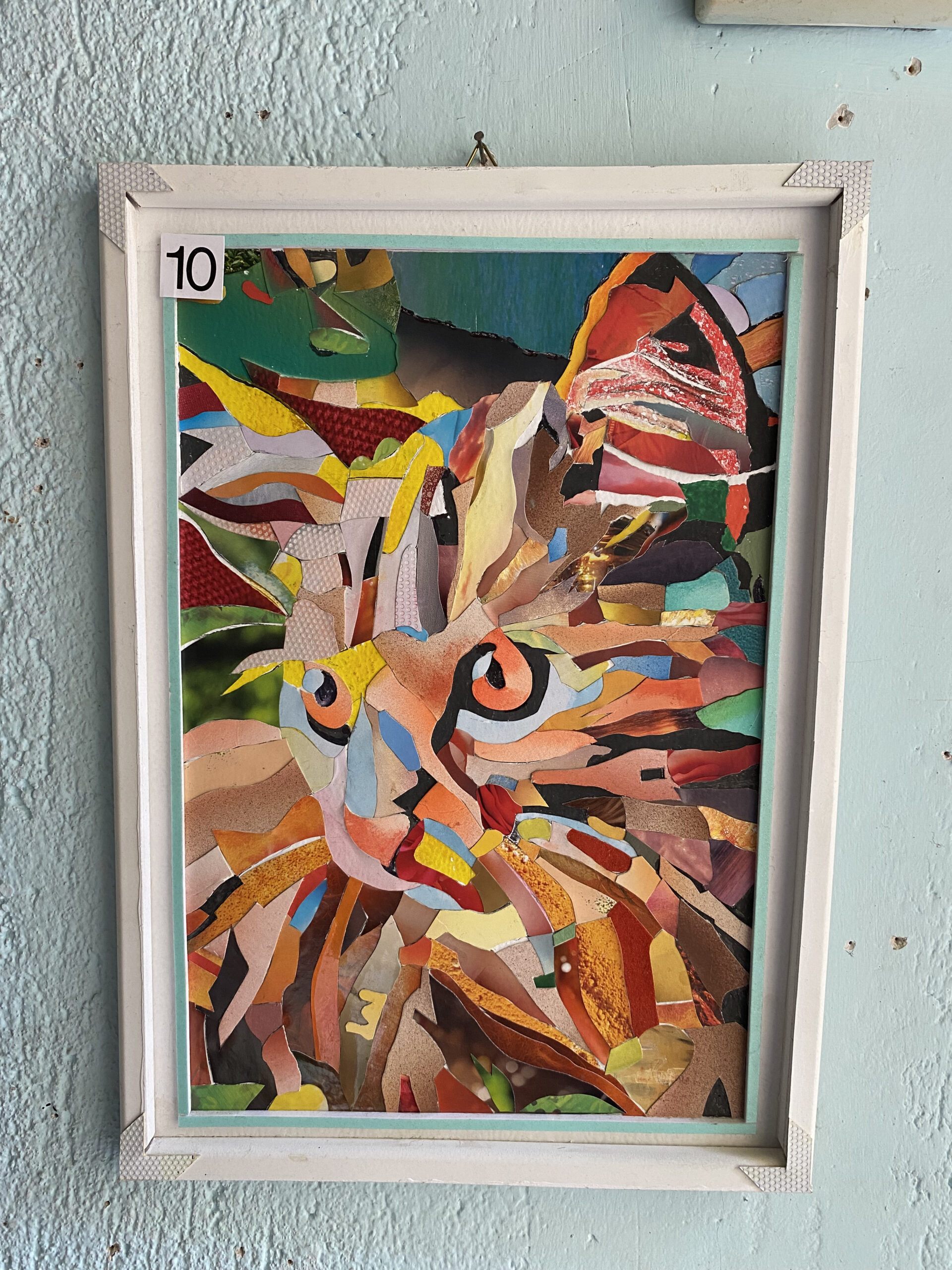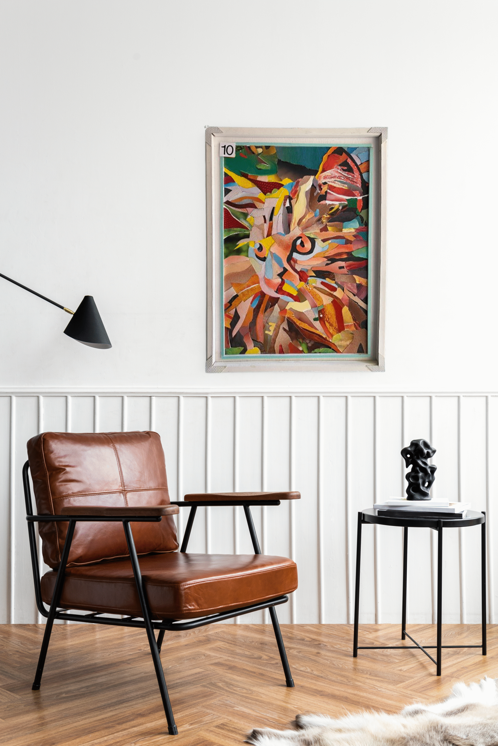 Експресивна мозайка от ръчно изрязани цветни фрагменти, които изграждат ярък котешки силует с хипнотични очи. Топли медни, коралови и охрови парчета се преплитат с изумрудени, тюркоазени и кобалтови акценти. Контрастни светло‑тъмни вмъквания моделират муцуната и погледа, а многослойната структура създава жив релеф — усещане за движение на козината и жизнен характер. Колажният фон добавя дълбочина. Елегантна бяла рамка — готово за окачване.