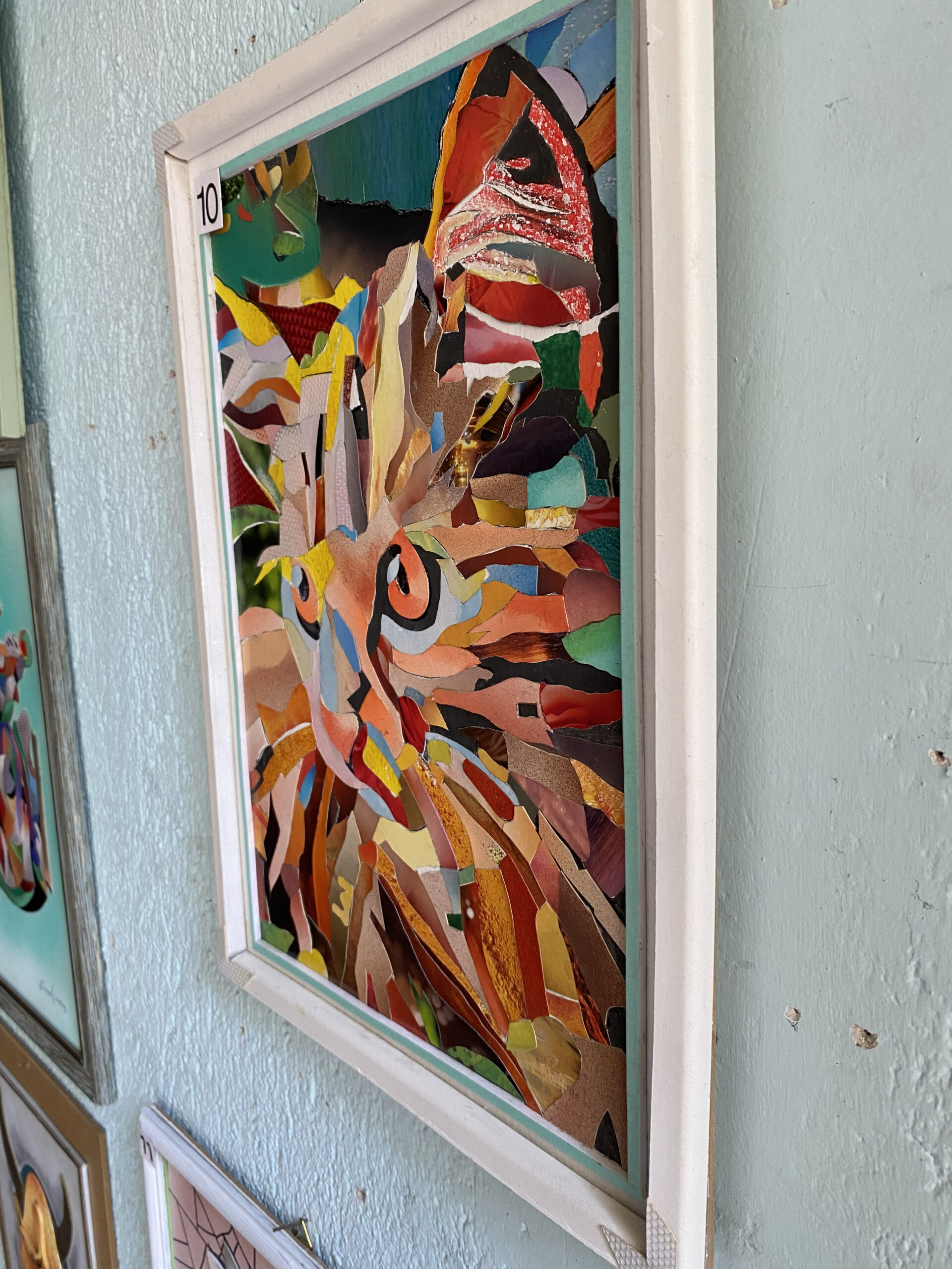 Мозайчна Котка — експресивен колаж с хипнотичен поглед и жив релеф.