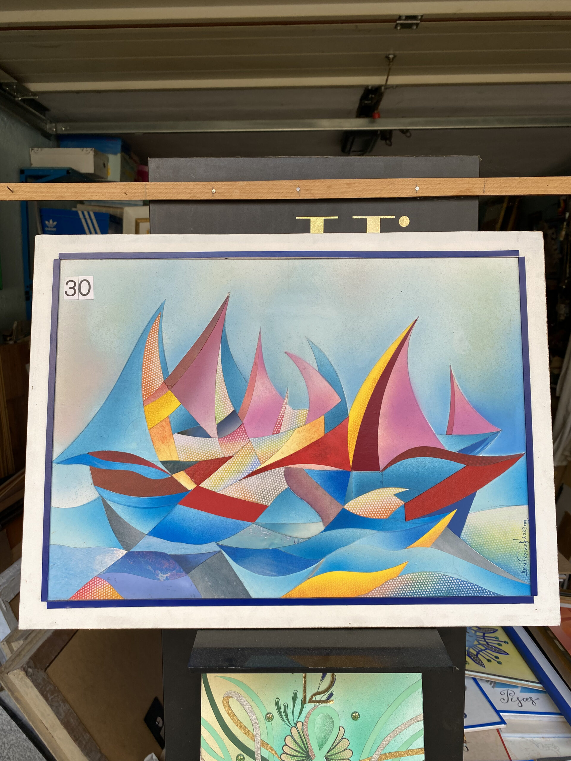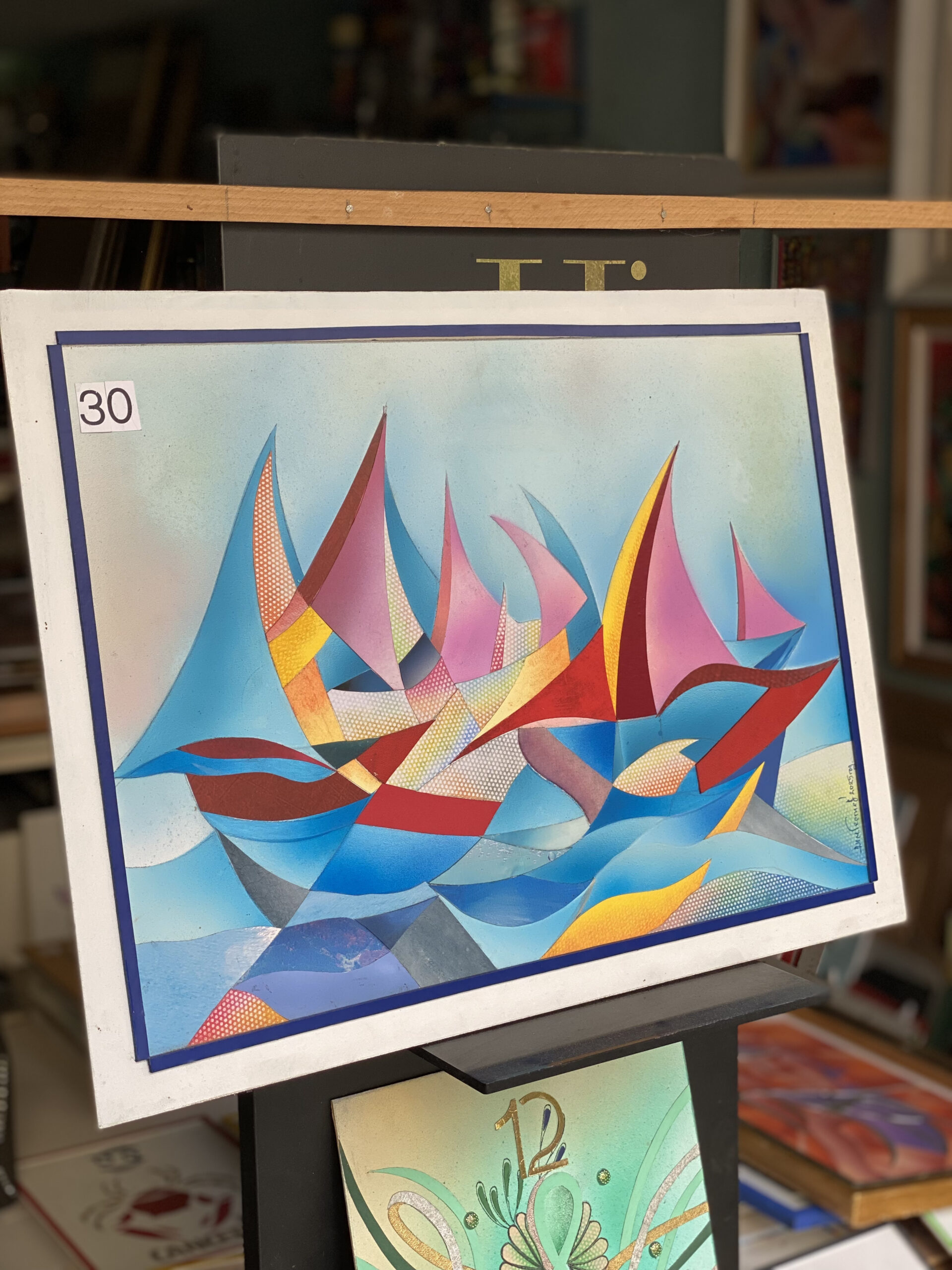 Динамична морска сцена на регата, разказана чрез остри, ветровити форми и плавни вълни. Слоеве в ултрамарин, тюркоаз и небесно синьо се преплитат с платна в магента, керемидено червено и слънчева охра. Полутоновите точки по част от платната носят усещане за блясък и солен спрей, а градиентното небе добавя простор и дълбочина. Композицията съчетава енергията на състезанието с онзи летен „полъх“, който освежава интериора.