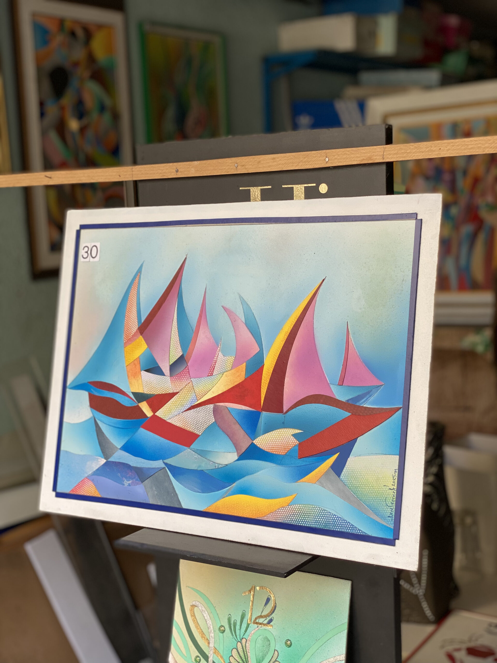 Техника: аерограф за преливките на небе и вода; акрил за чистите цветни полета; фини графични контури за ритъм и яснота. Оригинал с авторски подпис, хоризонтален формат, повърхността е защитена с безцветен лак. Произведението е без рамка — свобода за персонално рамкиране; при интерес съдействаме за избор на подходяща рамка от художника.