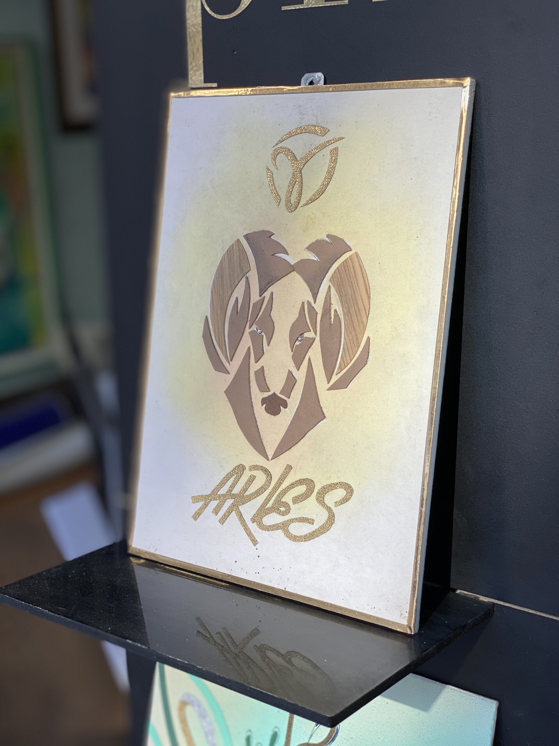 Овен е знакът на първия импулс и смелото действие. Тази версия представя минималистичен, геометричен силует с подчертани рога и златисто излъчване. Златните елементи и текстурата на надписа подчертават премиум усещането; при светлина акцентите меко проблясват и правят миниатюрата моментално разпознаваема на рафт, бюро или витрина.
