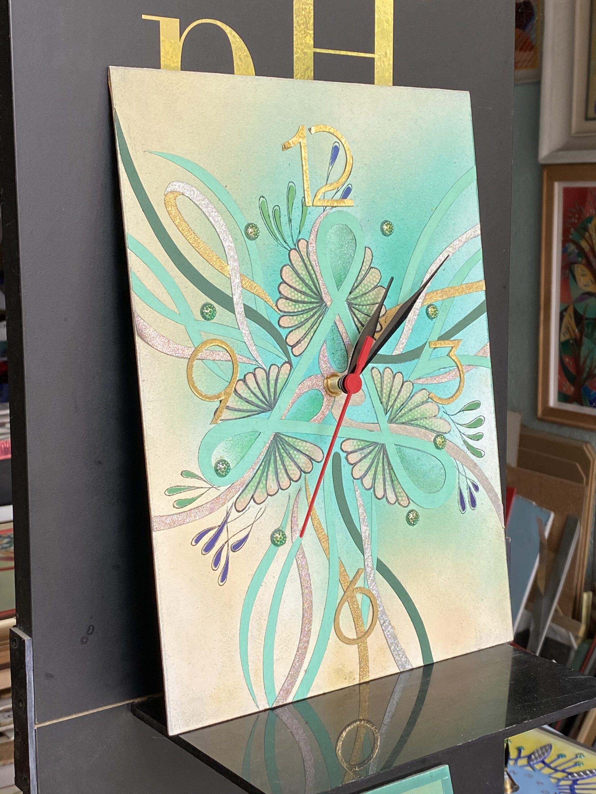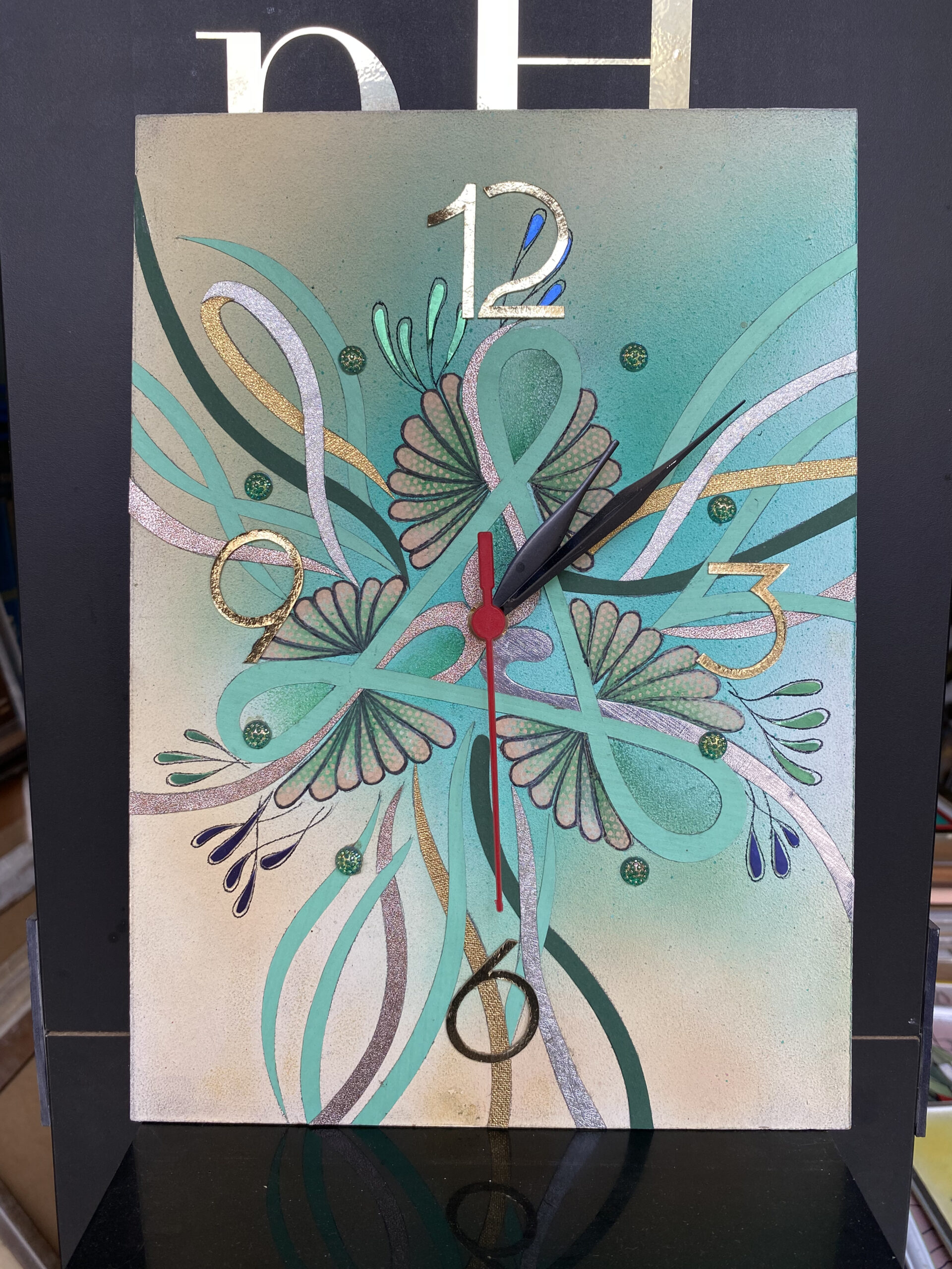 Вдъхни живот и елегантност на своето пространство с този изящен стенен часовник, вдъхновен от морската стихия. Абстрактна композиция с деликатни форми, вливания на аквамаринови нюанси и преливащи елементи, които създават усещане за движение и тайна.