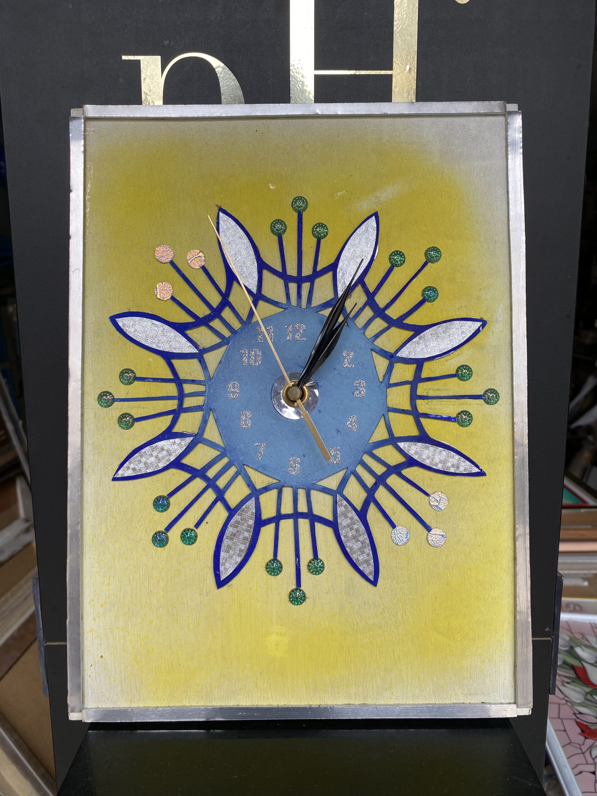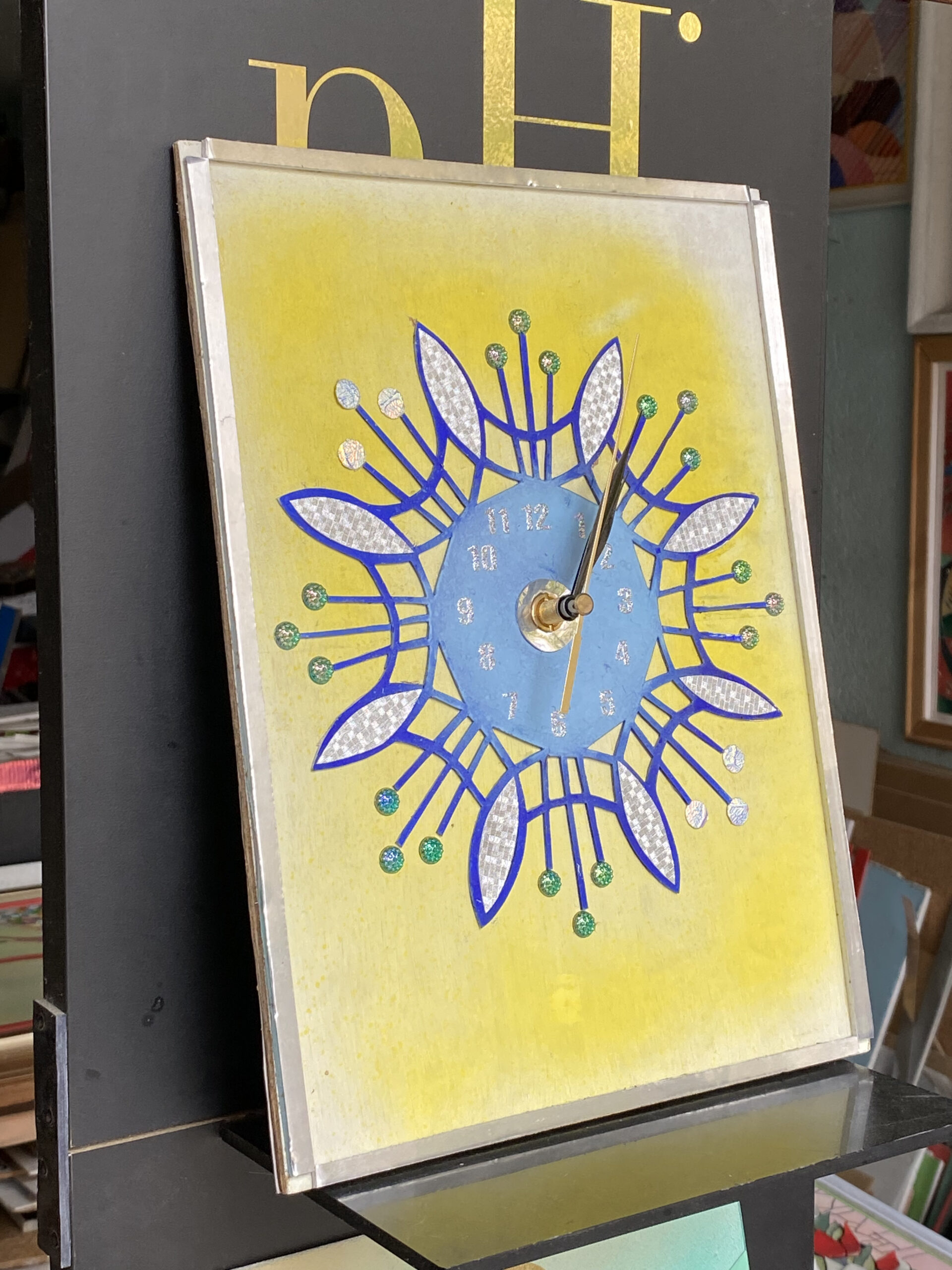 Ръчно изработен стенен часовник с авторски арт дизайни – комбинация от абстрактно слънце и стилизирано цвете в центъра на нежна жълто‑сребриста преливка.