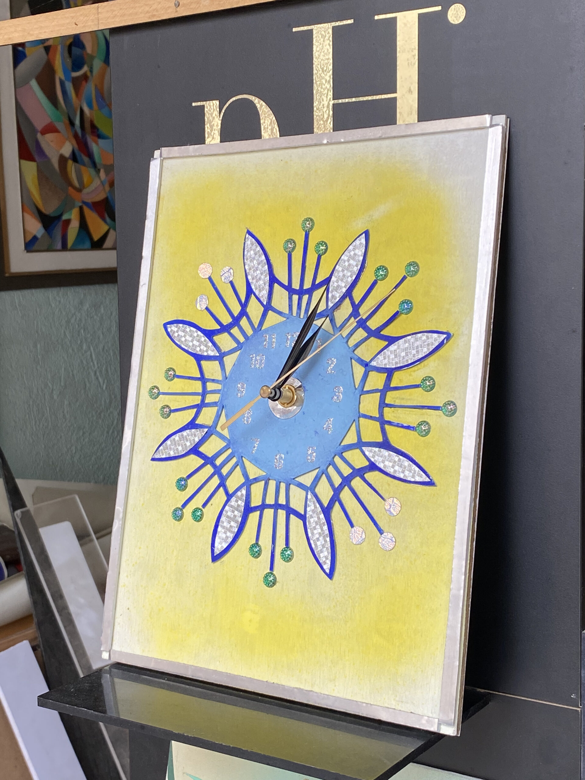 Часовникът е изработен с комбинирана техника (аерограф, акрил, релефни и брокатени елементи) върху твърда основа и запечатан с защитен лак за дълготрайност и лесна поддръжка.