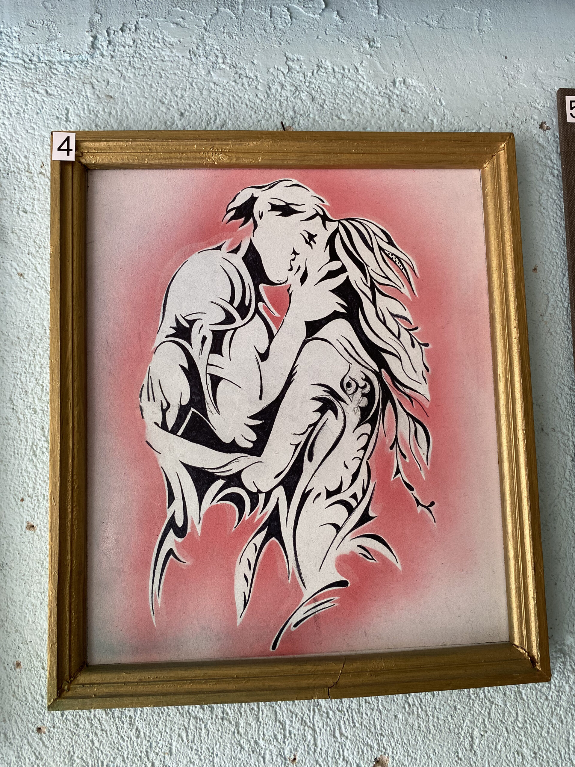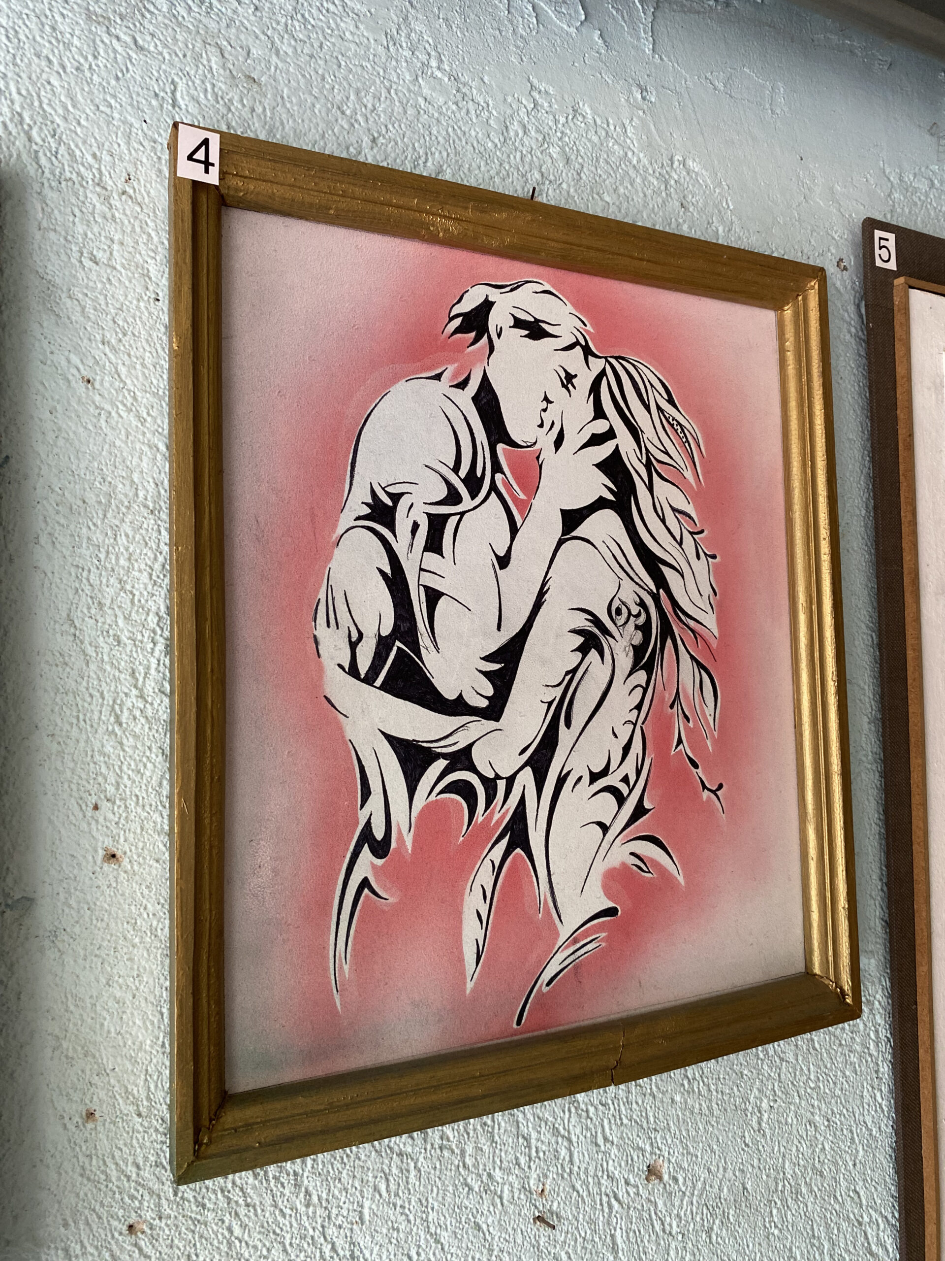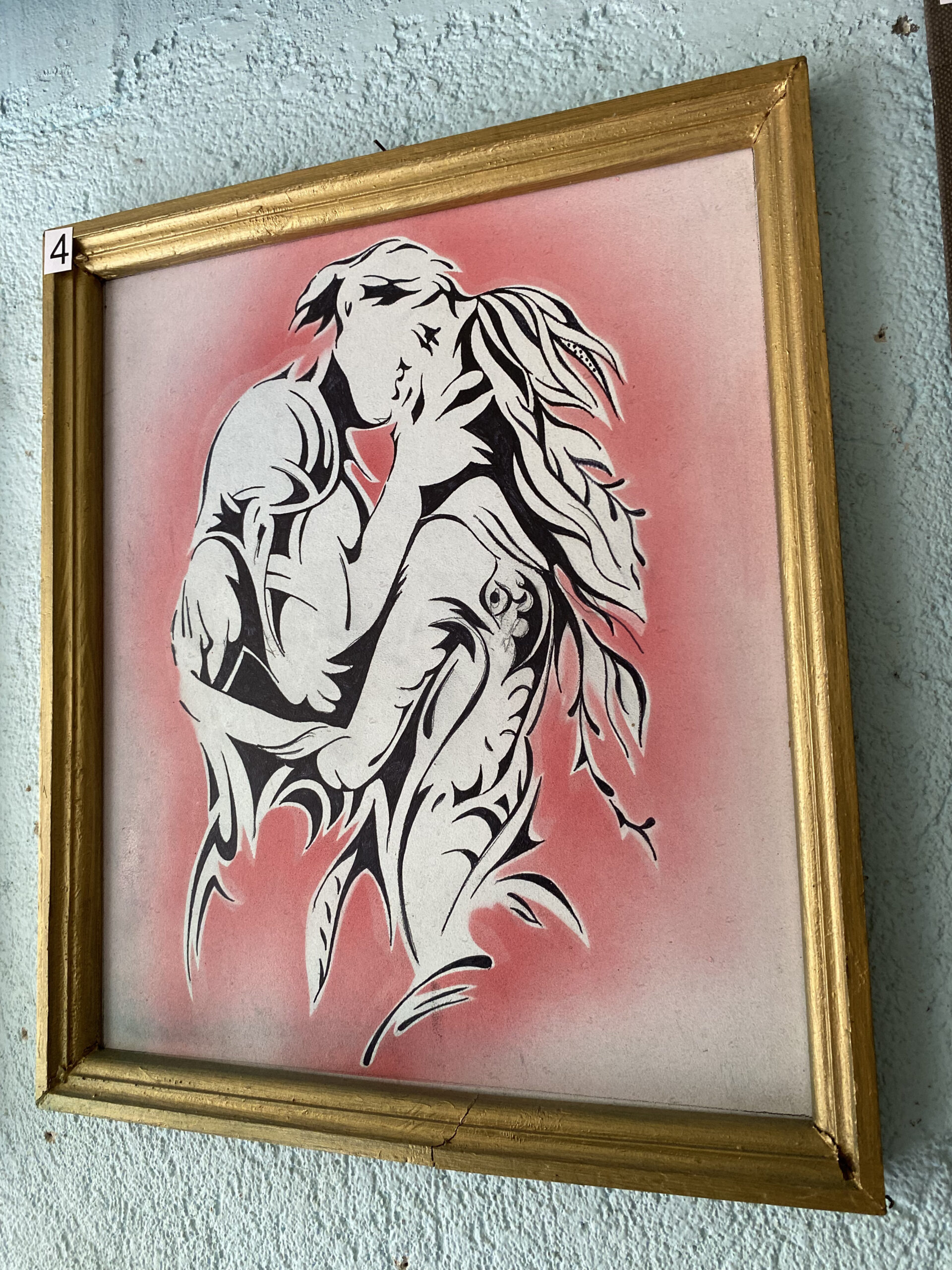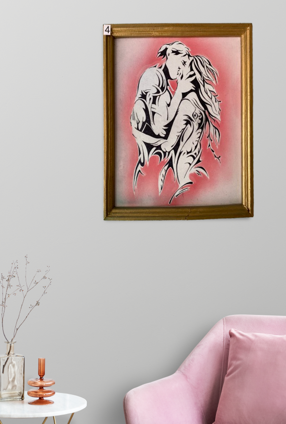 Оригинална абстрактна композиция от прегърнати силуети в силен черно‑бял контраст, обгърнати от мек розов ореол. Графичната линия е еластична и чиста, създаваща усещане за близост, топлина и романтика. Златистата рамка подчертава темата и внася фин празничен блясък — готов фокус за модерна стена.