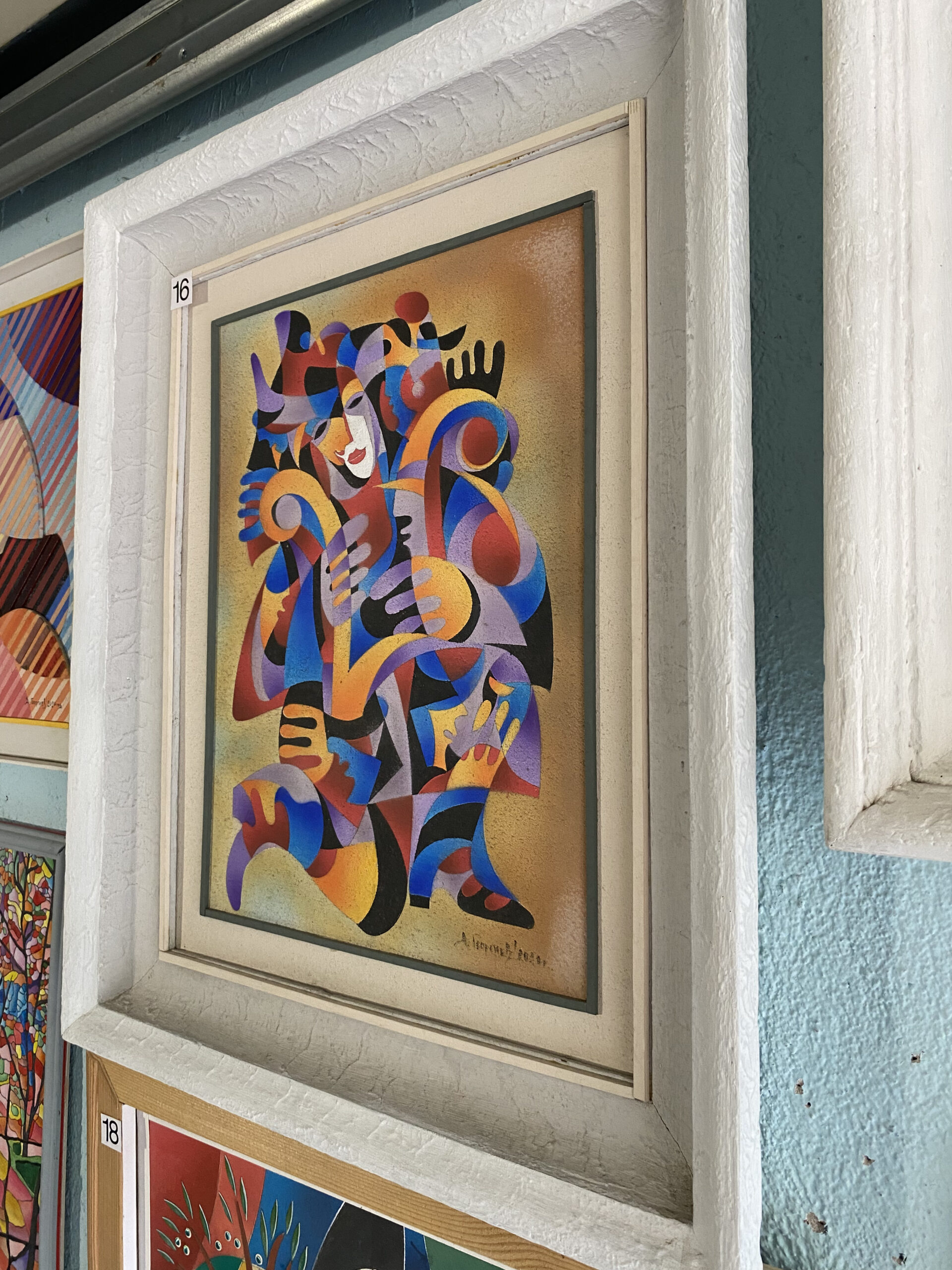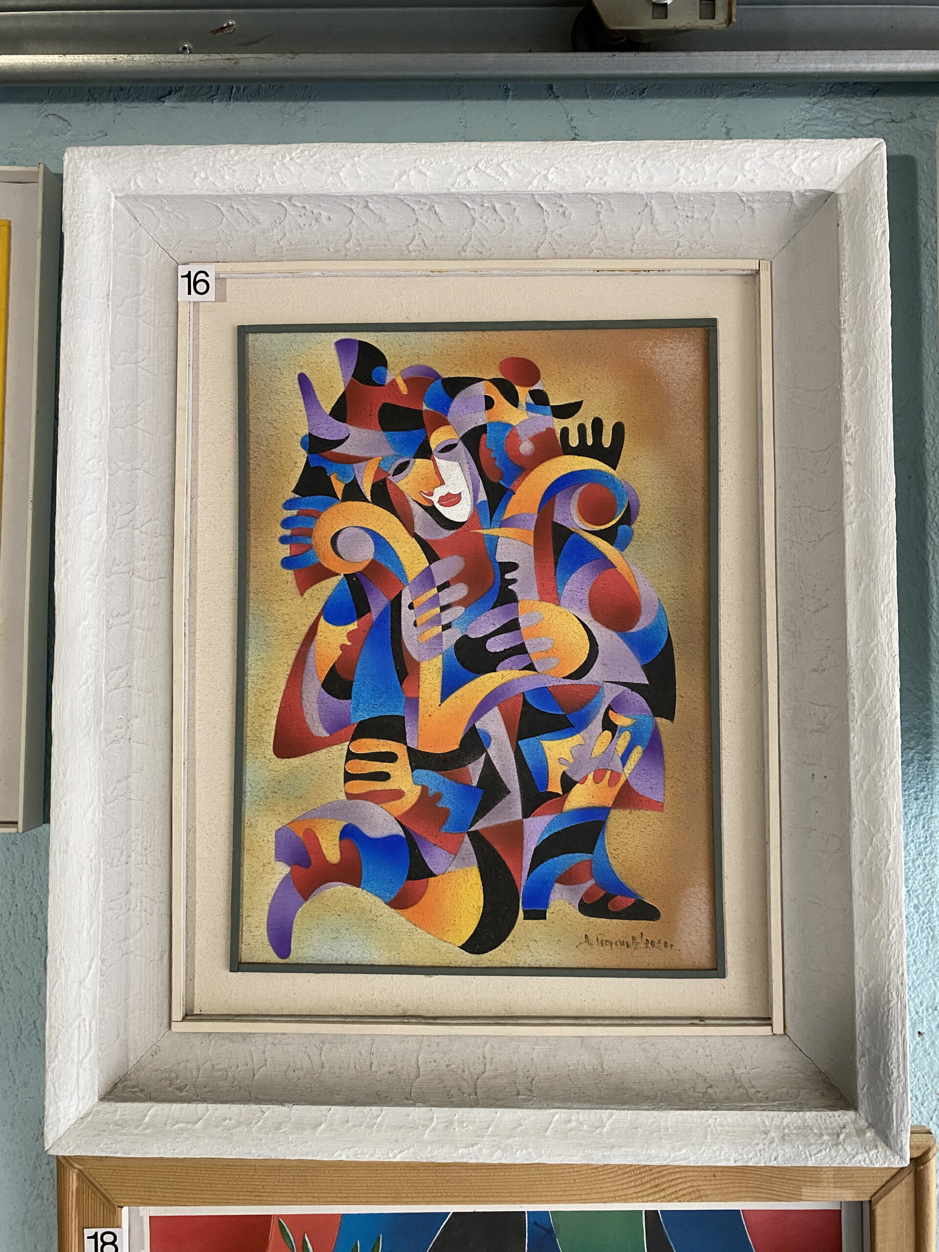 Динамичен кубистично‑абстрактен образ от цветни извивки и ритмични сегменти в синьо, лилаво, жълто и червено. Централното бледо лице и многобройните стилизирани ръце внушават музика, движение и театралност.