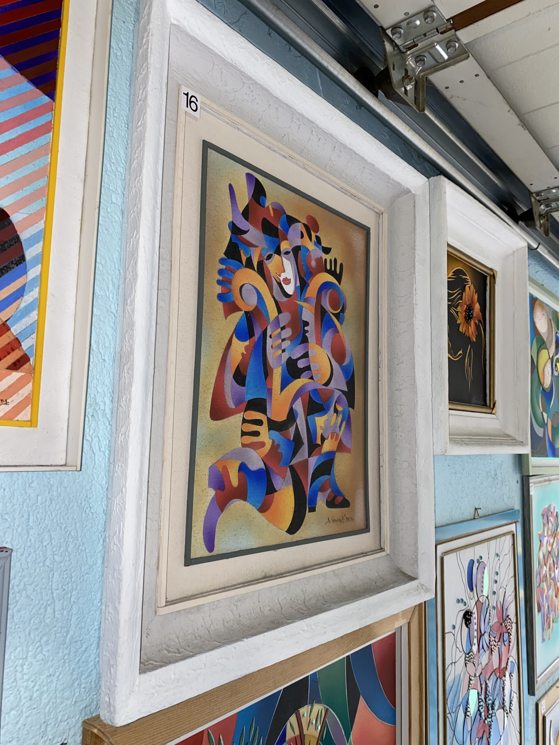 Смесена техника: аерограф + акварел + висококачествени релефни материали, защитено с безцветен лак за дълготрайна яркост. В светла бяла рамка със светло паспарту — готово за окачване.