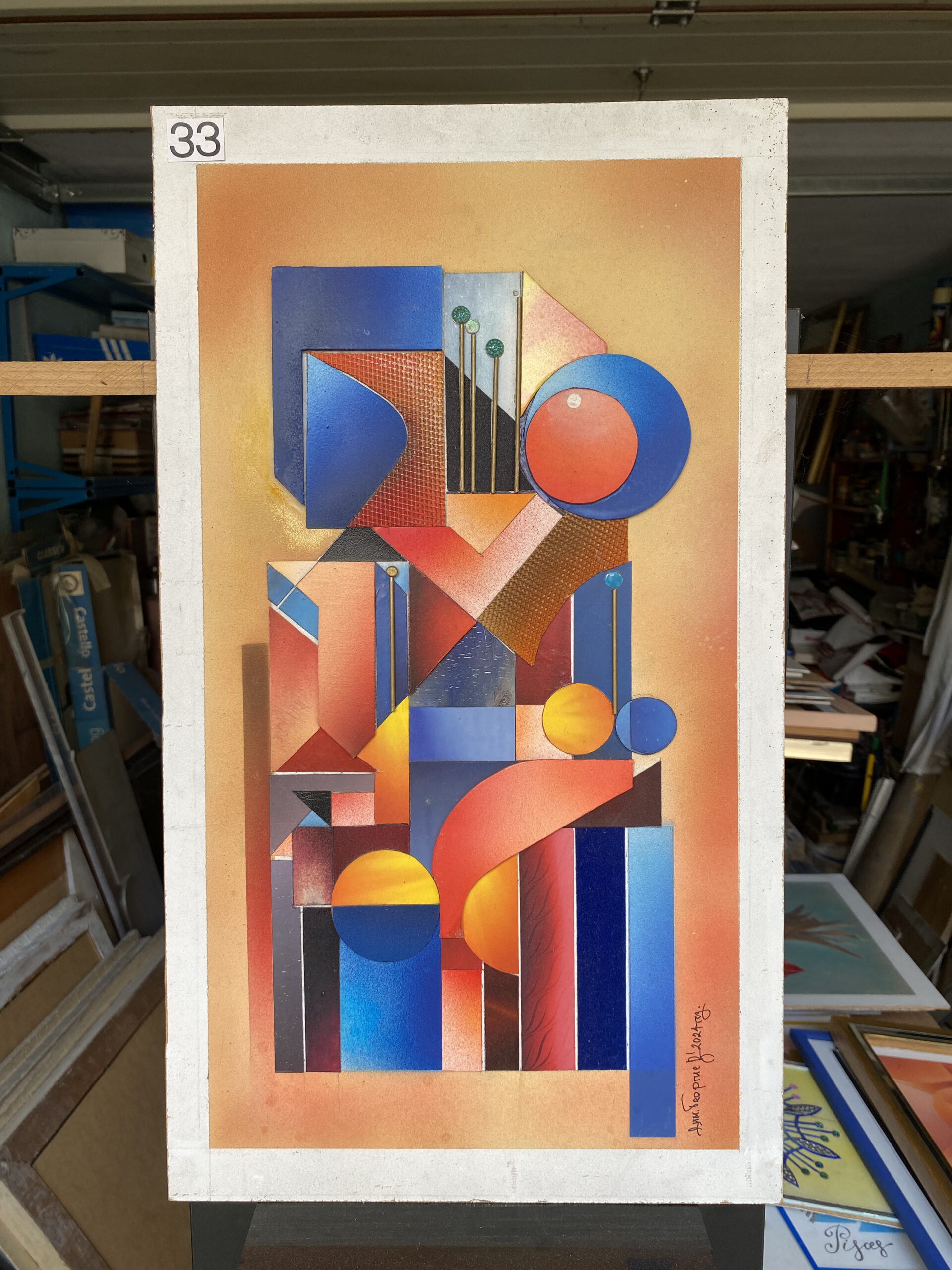 Абстрактно‑фигуративна сцена от прецизни кръгове, арки и правоъгълни плоскости, подредени като градски силует/съвременна скулптура. Палитрата съчетава кобалтово синьо, ултрамарин и индиго с корал, амбра и слънчеви жълти акценти. Нежен градиент в охра и праскова изгражда топъл фон, а фини текстурни фрагменти (мрежа/релеф) внасят индустриален „тих лукс“. Светещите кръгове‑„слънца“ и вертикалните „пинове“ добавят баланс и динамика — композиция на светлина, форма и движение.